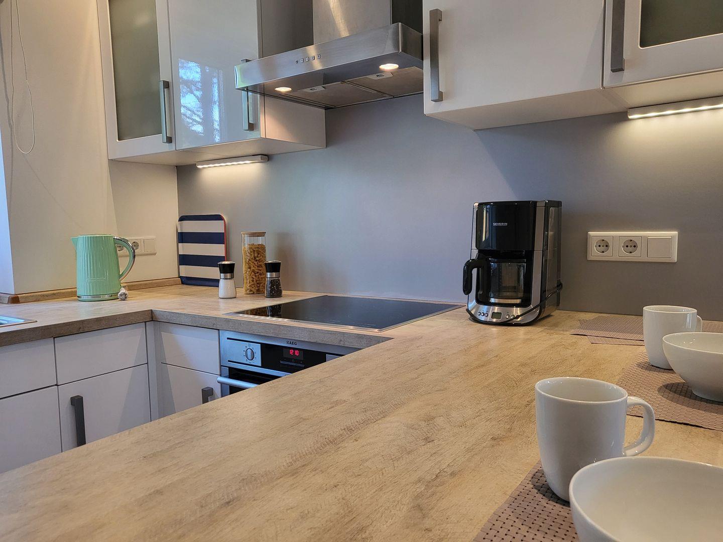 Offen zum Wohnraum liegt die sehr gut ausgestattete Küche der Ferienwohnung. Zu ihrer Ausstattung gehören unter anderem ein Induktionskochfeld und Backofen, Kühlschrank mit Gefrierfach sowie Geschirrspüler und Kaffeemaschine. Ein edler Frühstückstresen mit zwei Barhockern unterstreicht das Ambiente.