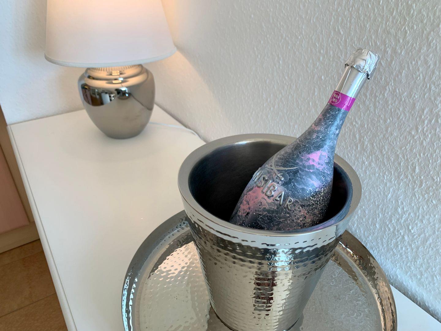 Die in den Raum integrierte moderne Küche ist vollumfassend ausgestattet. Hier gehören unter andere das Cerankochfeld, ein Kühlschrank mit Gefrierfach sowie Geschirrspüler, eine Kaffeemaschine und eine Mikrowelle mit Backfunktion zur Ausstattung. Um gebührend auf den Urlaub anstoßen zu können, steht ein edler Champagnerkühler zur Verfügung.