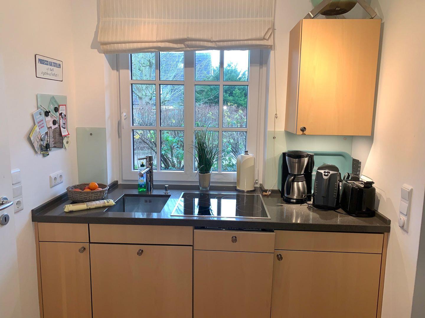 Die angrenzende, offene Küche ist modern und vollumfassend ausgestattet. Neben großem Cerankochfeld sowie Kühlschrank mit Gefrierfach gehören hier Geschirrspüler und Kaffeemaschine zur Ausstattung. Die Wohnung ist zusätzlich mit Insektenschutzgittern im Schlafzimmer und an der Terassentür ausgestattet.