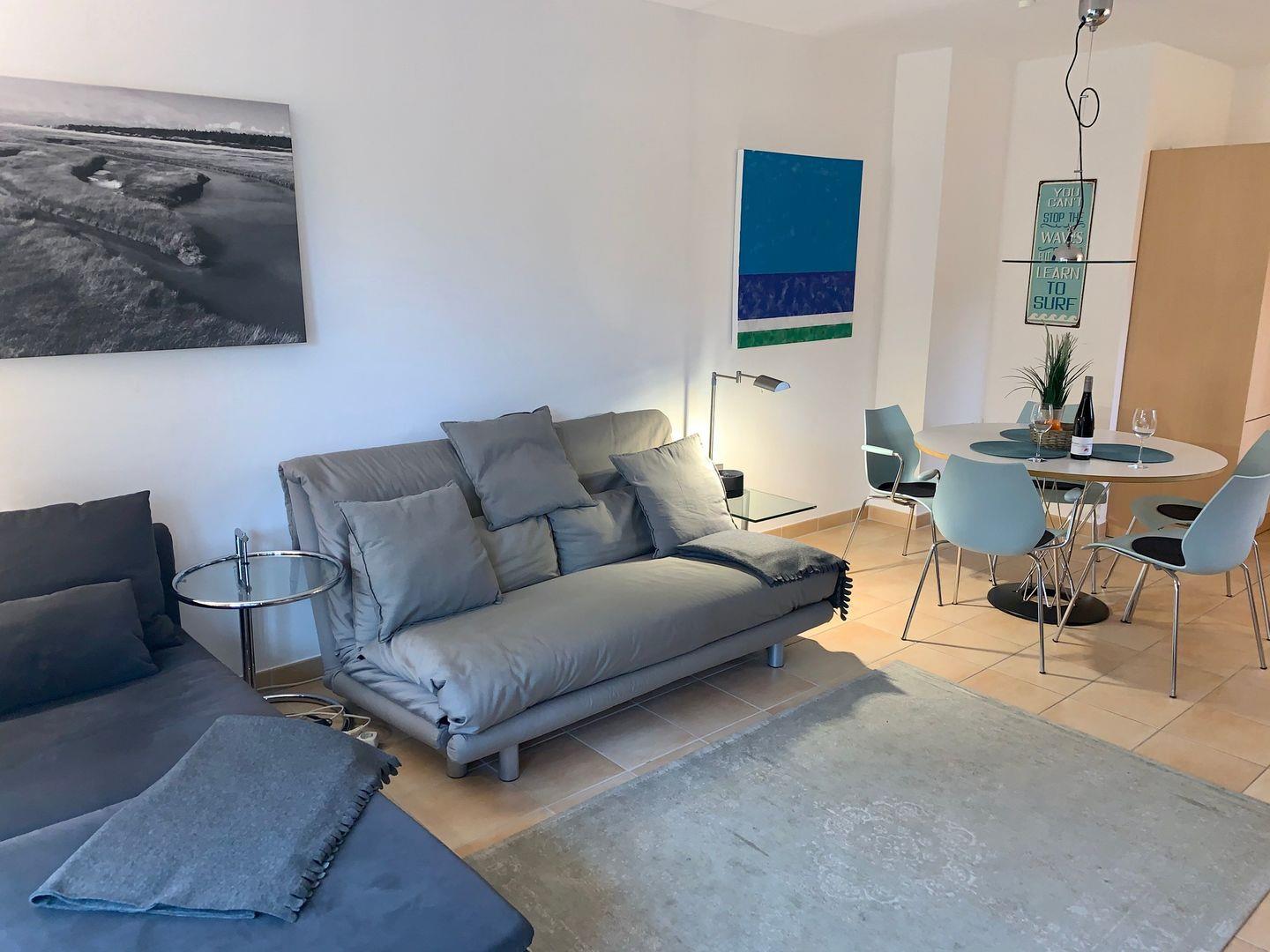 Das helle, ansprechend eingerichtete Wohnzimmer lädt mit einem urgemütlichen Sofa und einer komfortablen Liege zu gemütlichen Stunden ein. Für die multimediale Unterhaltung sorgt der große Flachbild-TV mit DVD und Blue-Ray-Player sowie kostenfreies W-LAN, am Esstisch genießen bis zu 5 Personen das Urlaubs-Dinner.