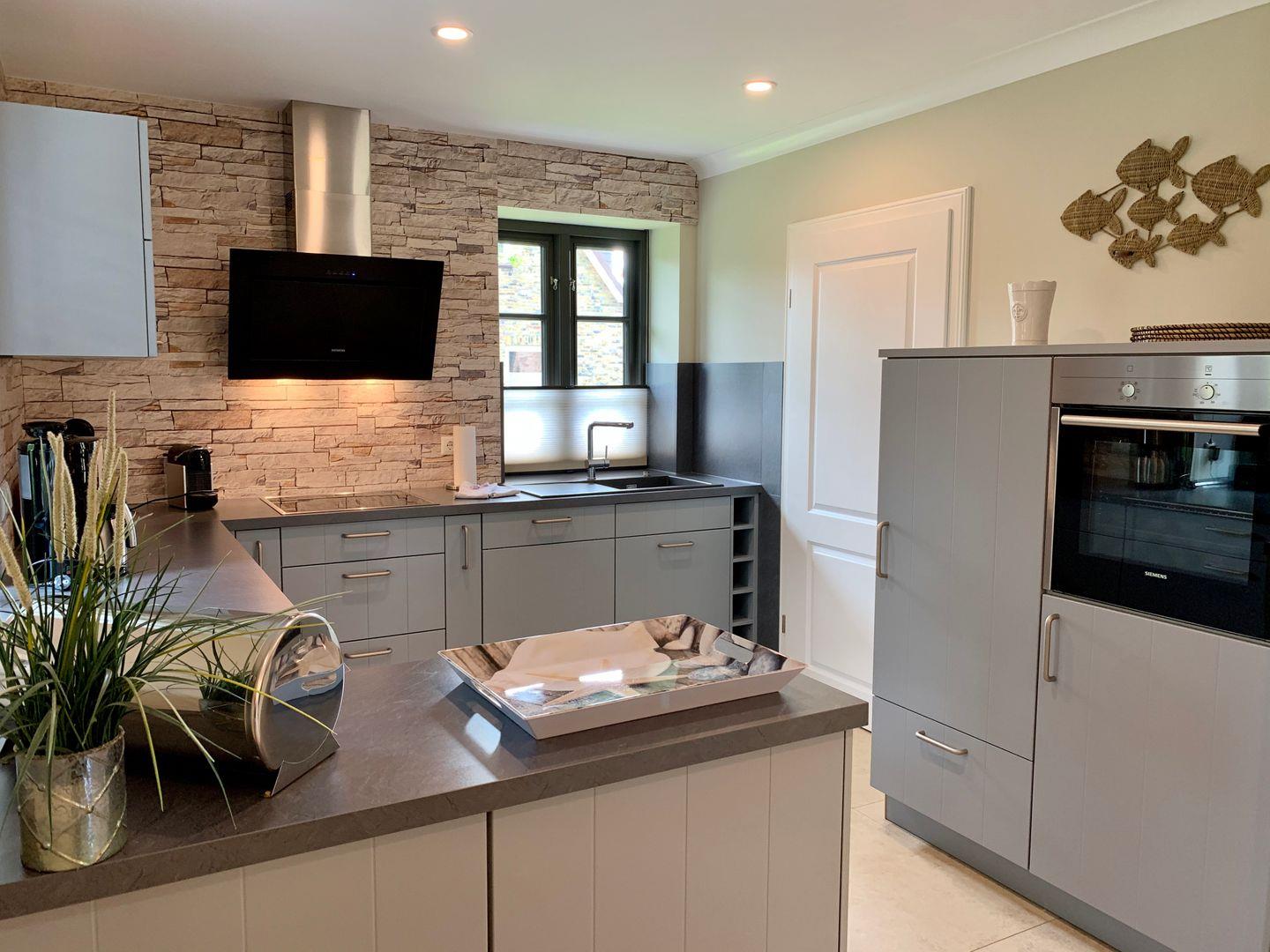 Unter anderem stehen Cerankochfeld und Backofen, ein großer Kühlschrank mit Geschirrspüler sowie zwei Kaffeemaschinen zur Verfügung – eine für klassischen Filterkaffee, eine weitere für Kaffeepads.