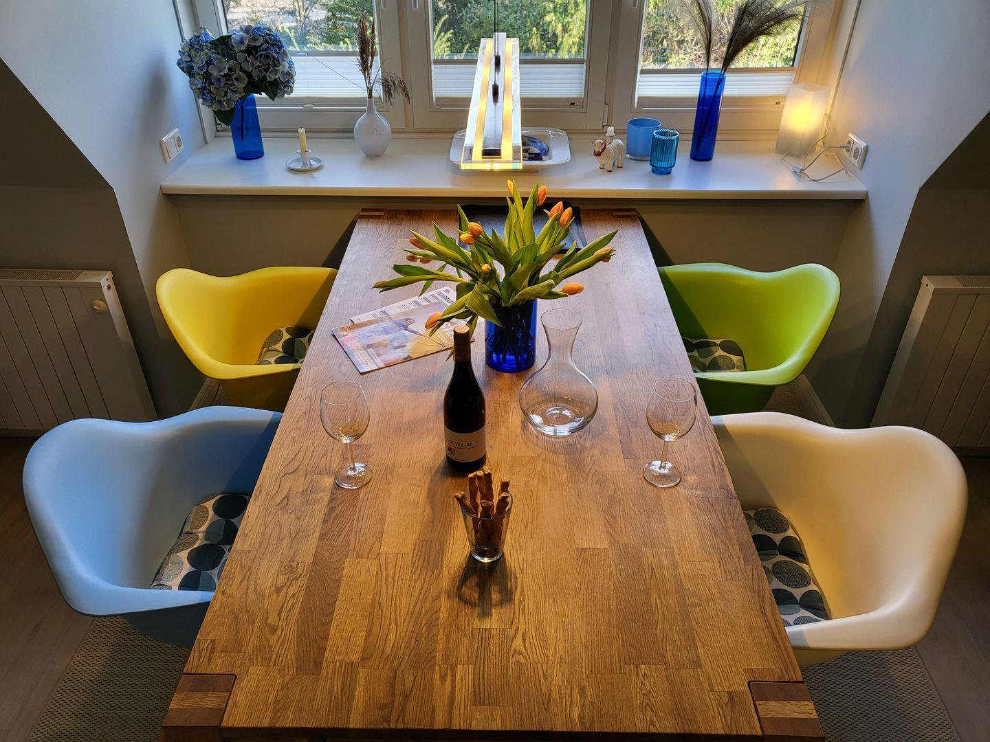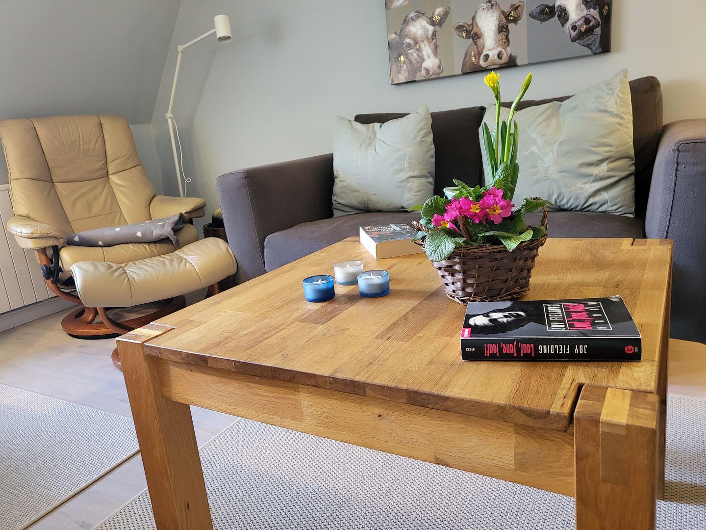 Der Wohnraum ist eingerichtet mit einer gemütlichen Sitzecke, Esstisch für 4 Personen sowie Flachbild-TV und Musikanlage. Kostenfreies W-LAN ist vorhanden.