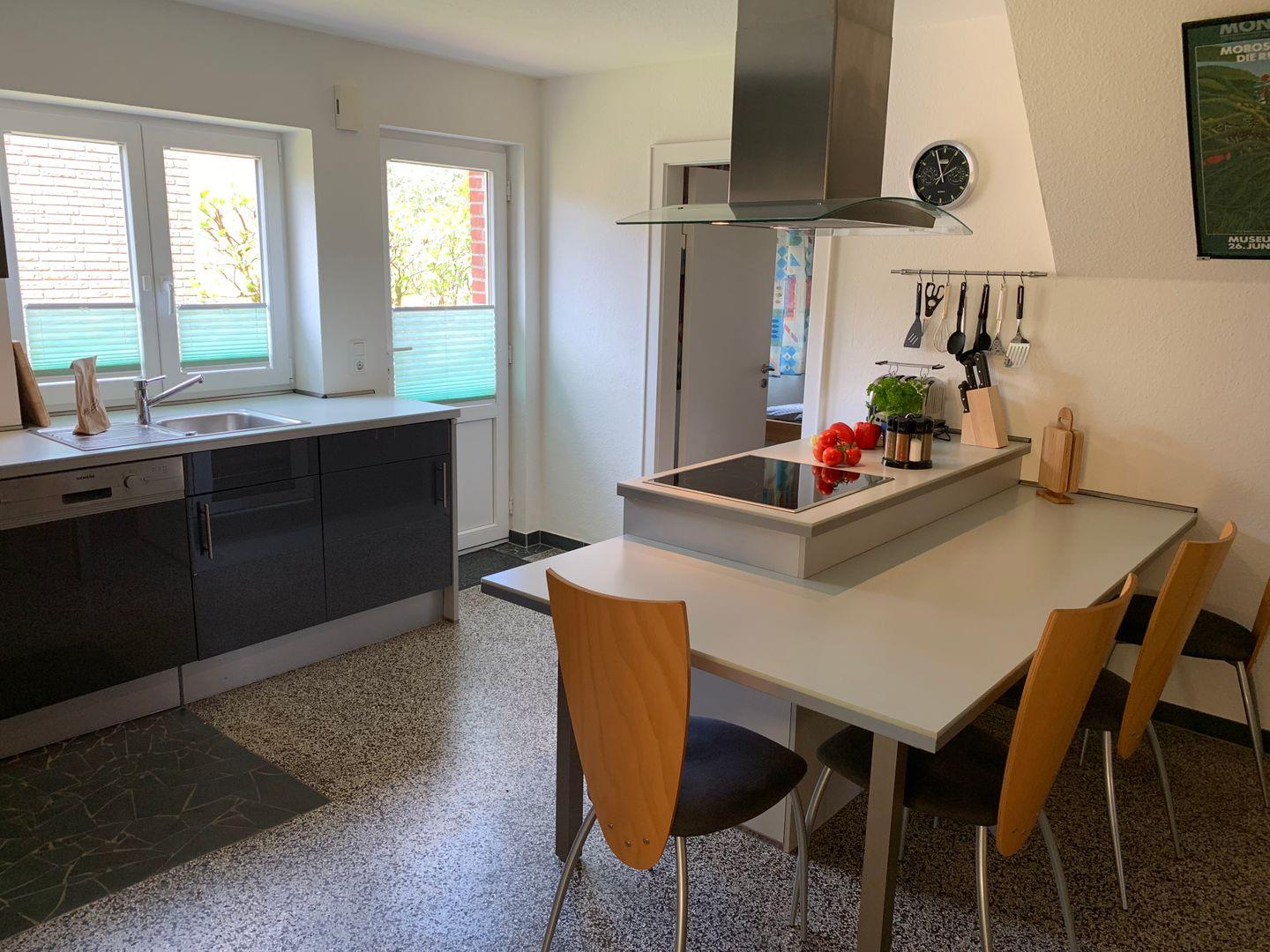 Die geräumige, helle Küche ist ausgestattet mit einer hochwertigen Einbauküche – dort stehen ein großes Cerankochfeld samt Backofen sowie Geschirrspüler, Mikrowelle und Kaffeemaschine zur Verfügung. Am Esstisch nimmt die gesamte Familie Platz.