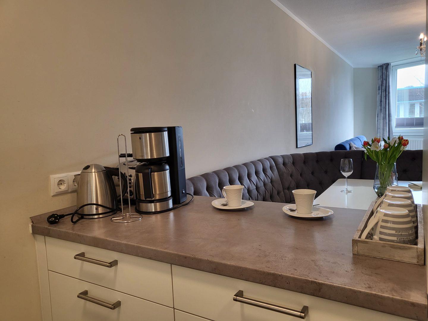 Integriert in den modern eingerichteten Wohnraum liegt die halboffene, sehr gut ausgestattete Küche mit Cerankochfeld und Dunstabzugshaube sowie ein Backofen mit Mikrowellen- und Grillfunktion.
