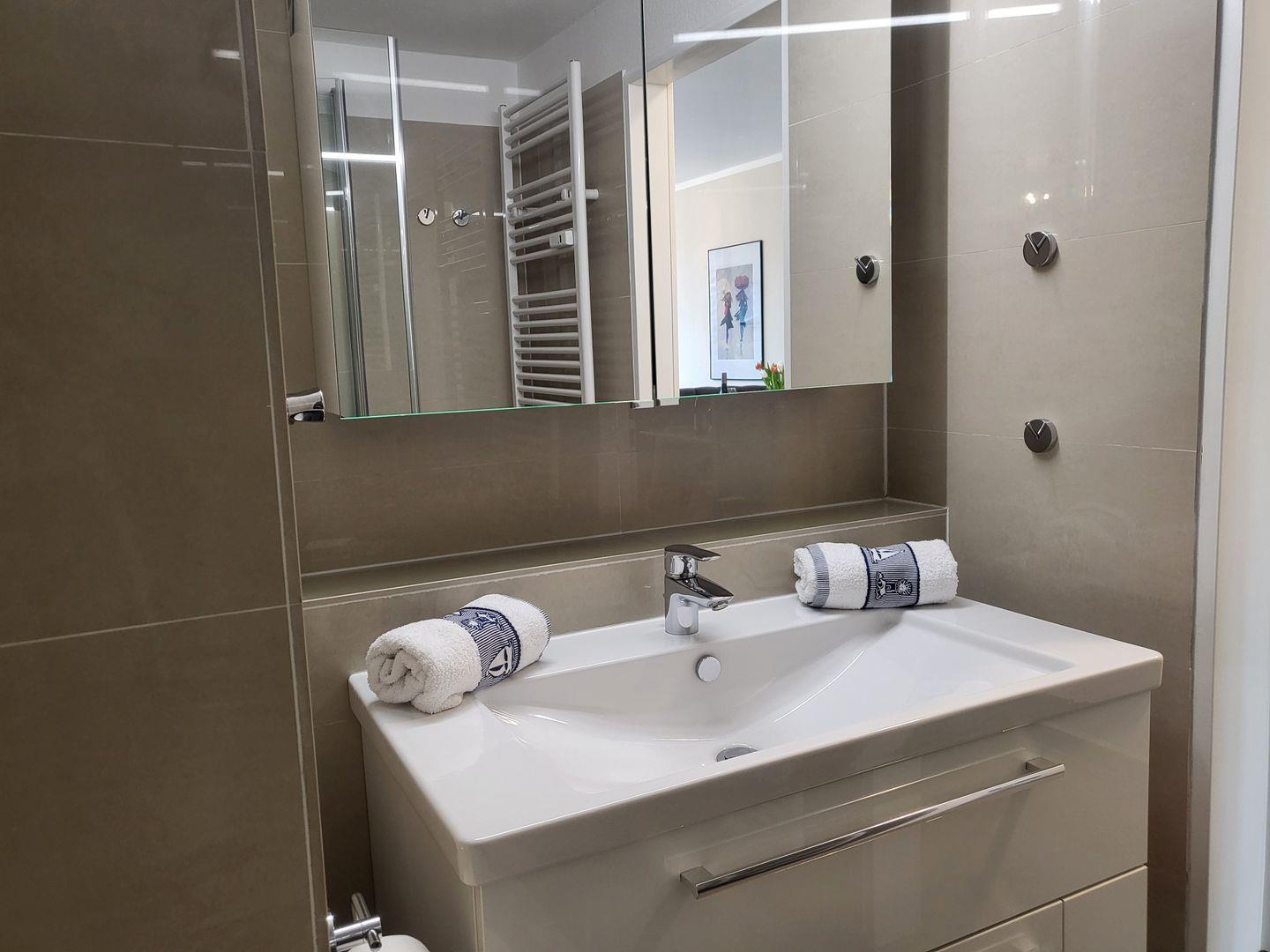 Die Ausstattung beinhaltet darüber hinaus eine moderne Handtuchhalterheizung, Spiegelschrank mit LED-Leuchte, Waschtisch mit Schubladen und ein WC.