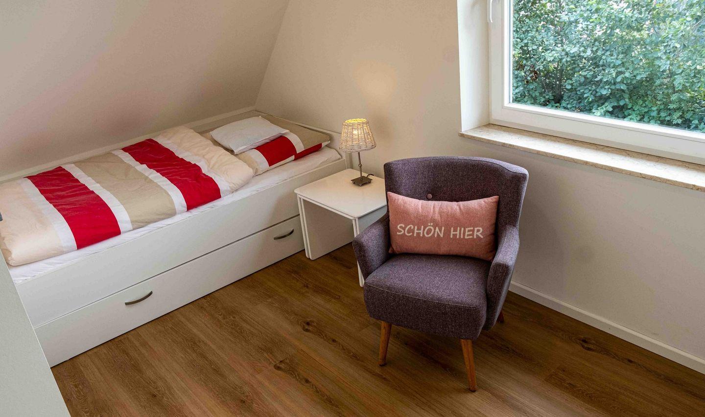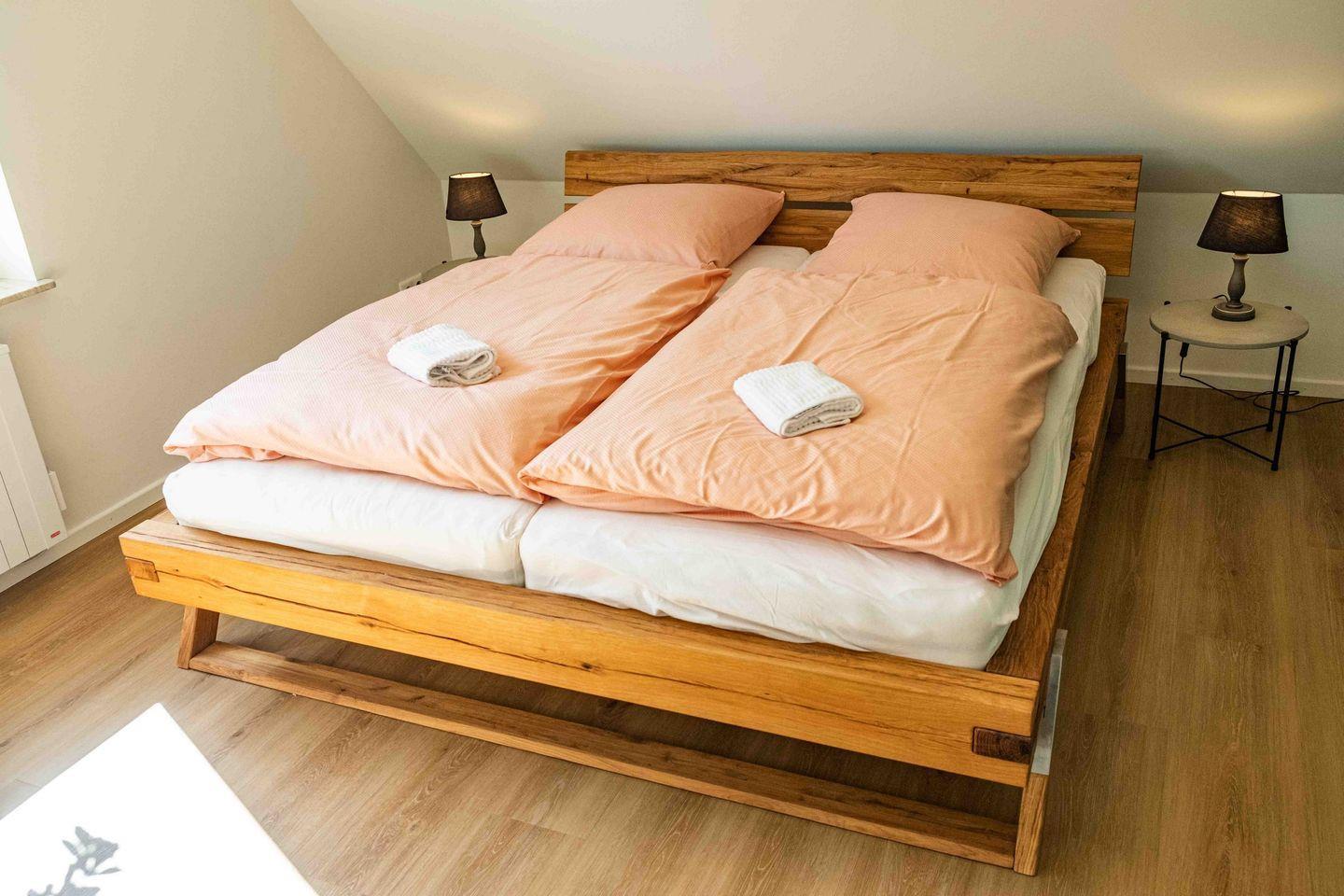 Ein separates Schlafzimmer mit Doppelbett und ein weiteres mit Einzelbett im OG, Duschbad mit WC vorhanden.