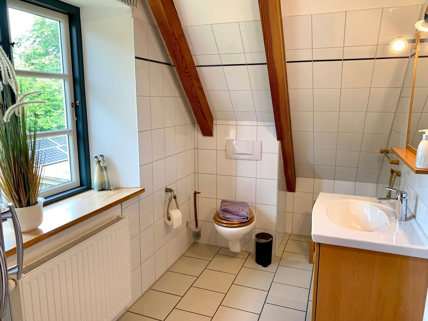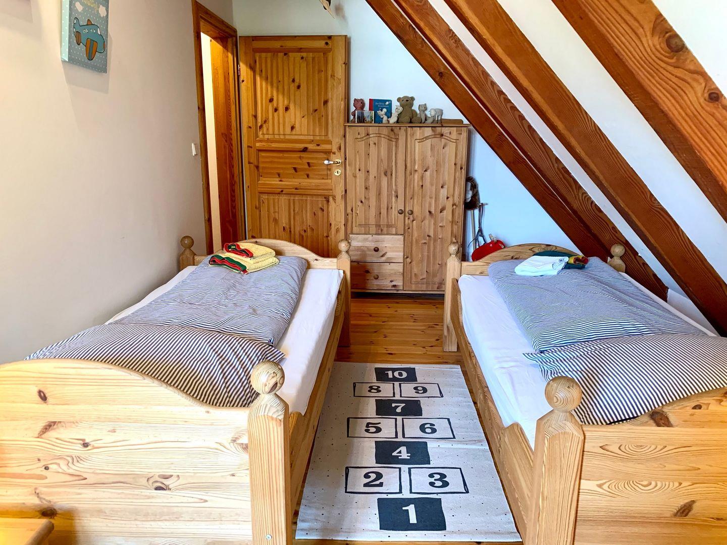 Im Obergeschoss stehen zwei Schlafzimmer zur Verfügung. Eines ist ausgestattet mit einem großen 180x200cm Doppelbett. Im zweiten Schlafzimmer stehen 2 Einzelbetten und ein Kinderbett bereit. Zur Ferienunterkunft gehört ein Duschbad mit WC, es kann von beiden Schlafzimmern aus erreicht werden.