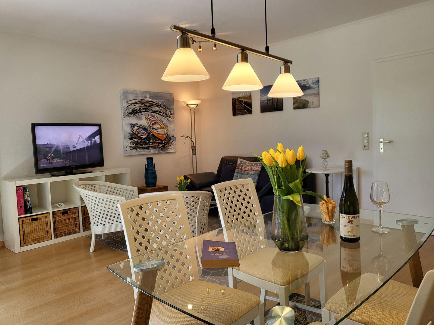 Der Esstisch bietet einen angenehmen Ausblick ins Grüne, für die multimediale Unterhaltung sorgen Flachbild-TV und kostenfreies W-LAN.