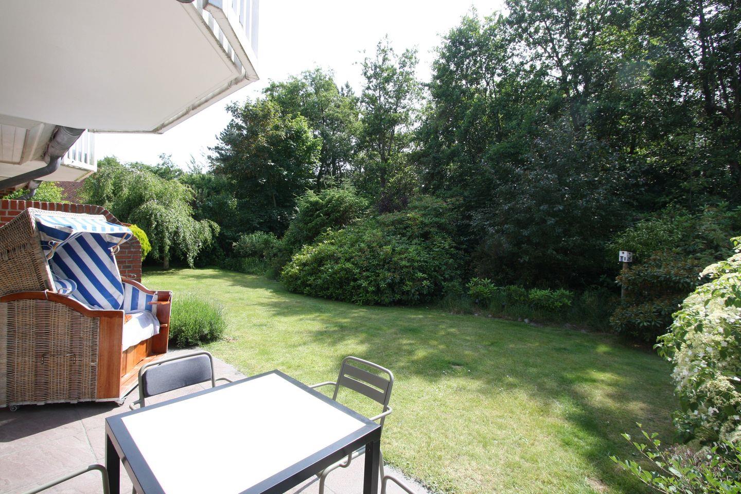 Die friesisch eingerichtete Ferienwohnung liegt im Erdgeschoss rechts und verfügt über 2 sehr gemütliche Zimmer und bietet zusätzlich eine Terrasse in Südlage mit kleinem Garten und Blick in den Kiefernwald. Dort lädt auch der Strandkorb zum Verweilen und Lesen ein.