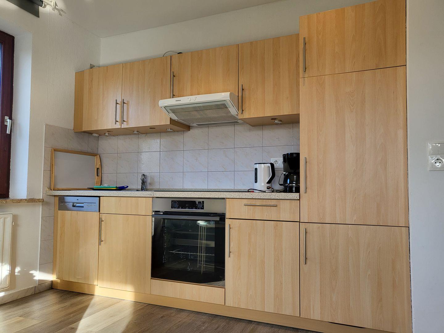 Das Wohnzimmer ist ausgestattet mit einem hochwertigen Schlafsofa und gemütlichen Sitzgelegenheiten. Für gemütliche Abende und Unterhaltung sorgen ein großer Flachbild-TV und kostenfreies W-LAN. Helle Farben, moderne Einrichtung und Panoramafenster sorgen für eine wohnliche Atmosphäre im Wohnraum. Die integrierte Küchenzeile ist sehr gut ausgestattet und bietet neben einem Induktionkochfeld und Backofen noch Kühlschrank mit Gefrierfach und Spülmaschine. Das Schlafzimmer ist ausgestattet mit komfortablem 180x200cm Doppelbett und einem großen Kleiderschrank. Ein Babyreisebett und ein Kinderhochstuhl stehen kostenfrei zur Verfügung. Zur Ferienwohnung gehört ein modern gestaltetes Badezimmer mit Dusche, Waschbecken und WC.