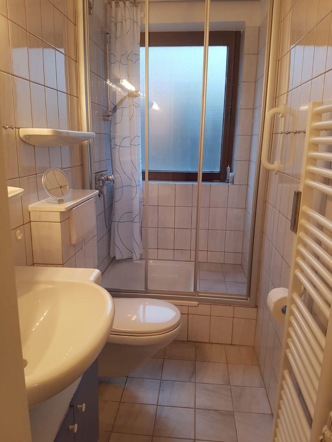 Zur Ferienwohnung gehört ein Duschbad mit WC, im Keller steht eine gemeinschaftlich nutzbare Münzwaschmaschine bereit.