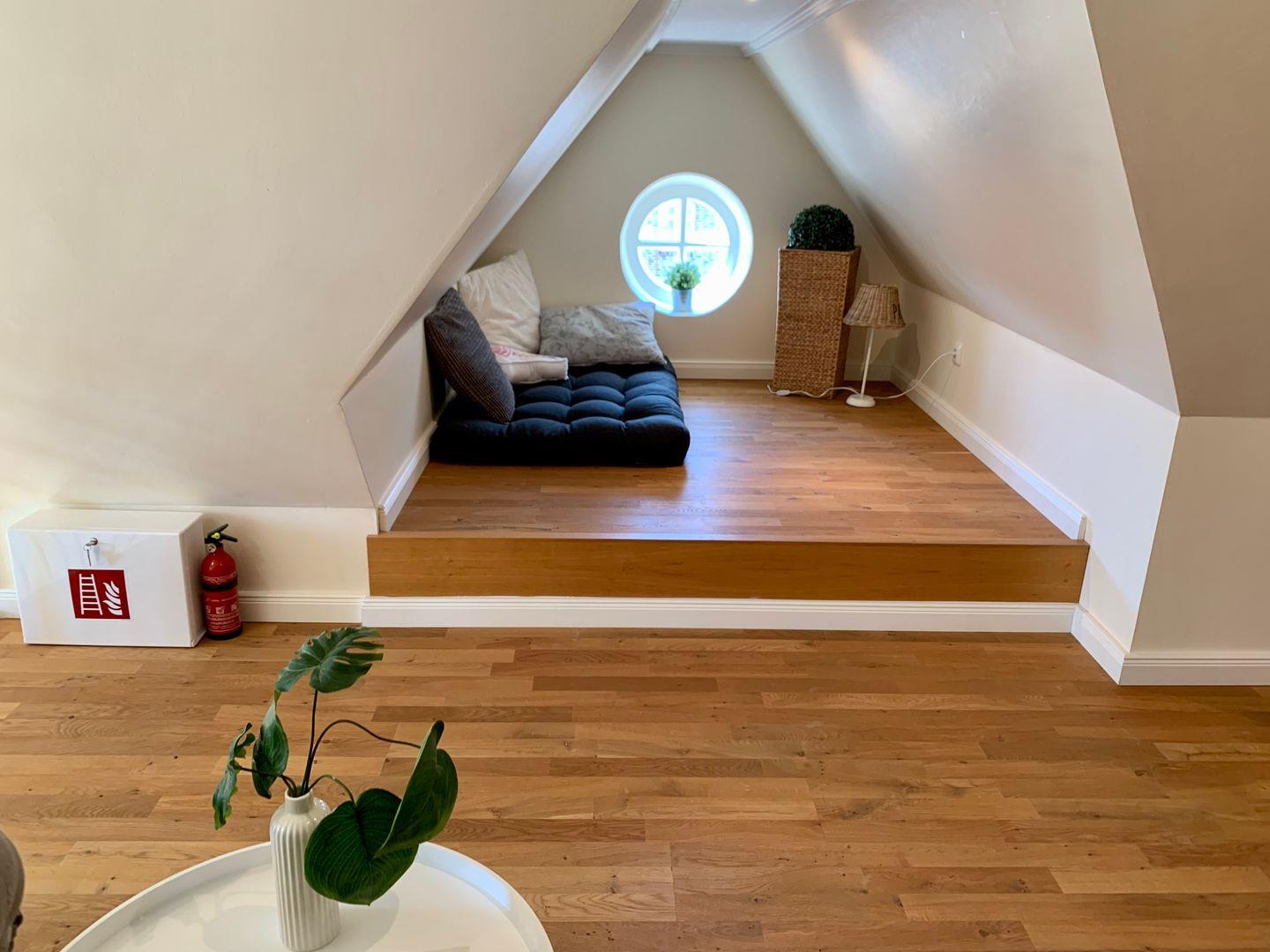 Im Dachgeschoss stehen auf der offenen Galerie zum Wohnzimmer hin ein 140x200cm Doppelbett sowie ein urgemütlicher Ohrensessel und ein Schreibtisch zur Verfügung.