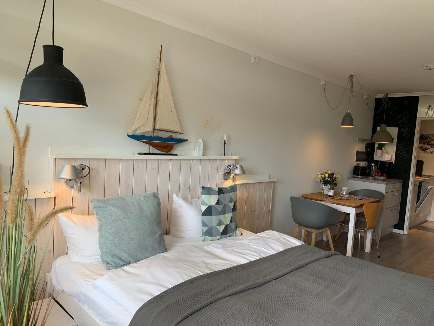 Zentral gelegene 1 Zimmer Ferienwohnung mit Balkon zur Seeseite für 3 Personen. Moderner Wohn-Schlafraum mit Doppelbett und Einzelbett, Duschbad mit WC, SAT-TV,