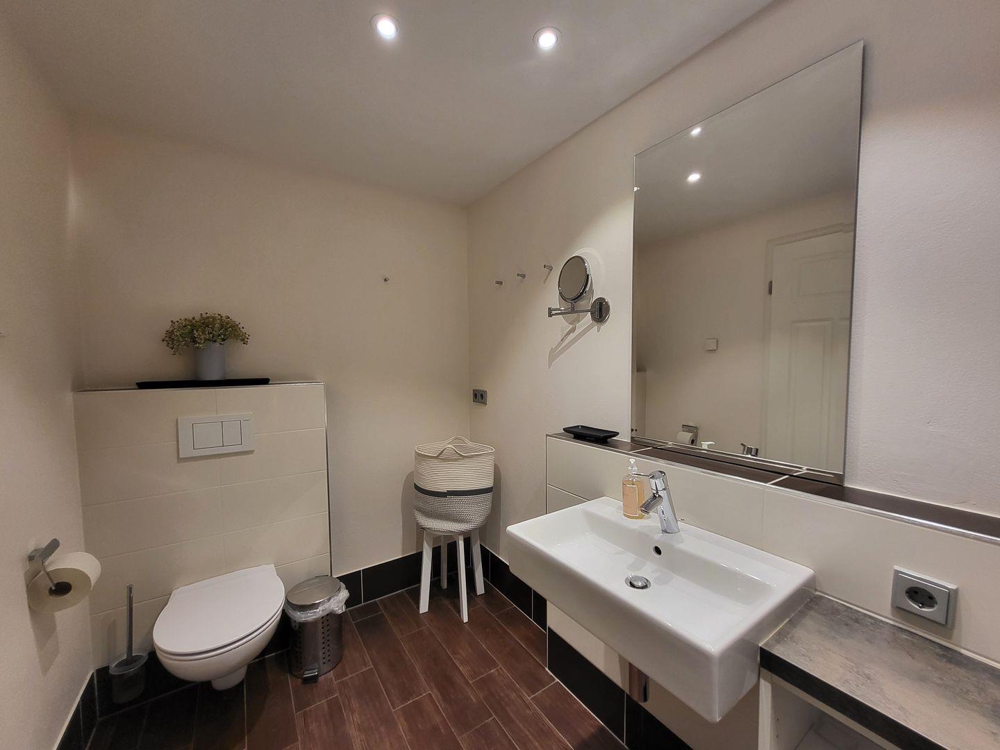 Das geräumige Luxusduschbad beeindruckt mit bodengleicher Dusche und elektrischem Handtuchtrockner, auch ein Haartrocknerist hier vorhanden.