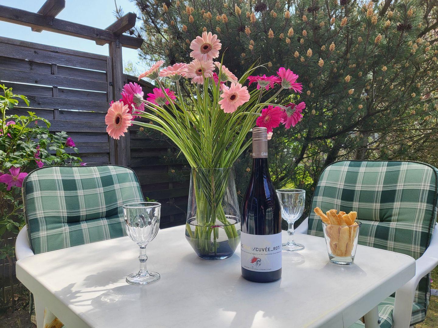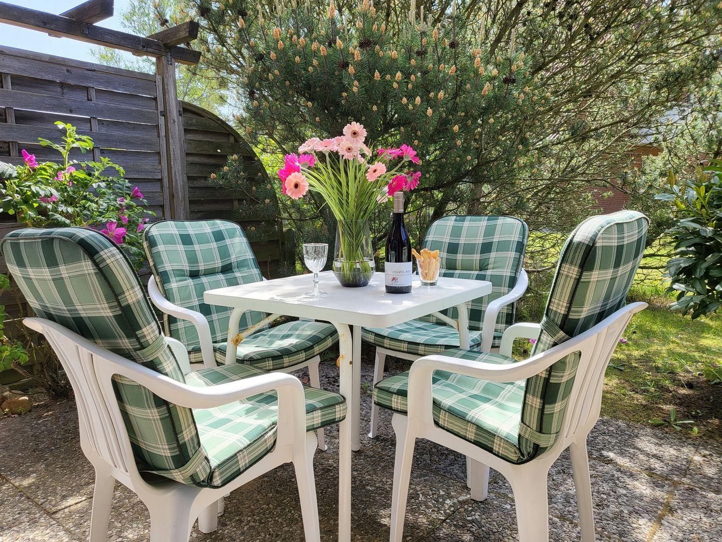 Zur Ferienwohnung gehört eine möblierte Terrasse mit Sonnenmarkise und Blick ins Gartengrün.