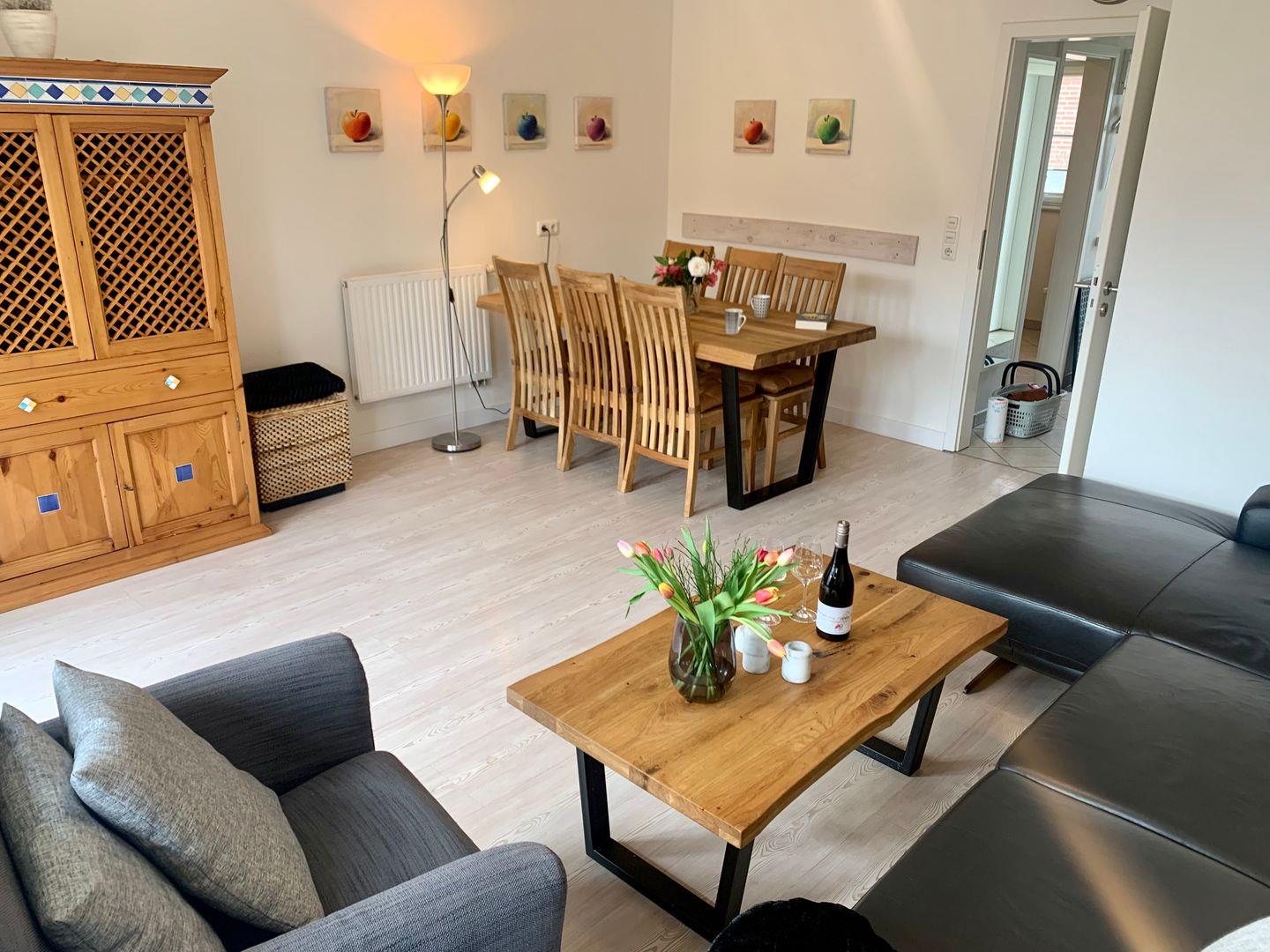 Ein großer hölzerner Esstisch, die sehr komfortable Couch und ein charmanter Sessel laden zum gemeinsamen Essen, Verweilen und Genießen ein. Hier finden Smart-TV mit DVD und Blue-Ray-Player Platz.