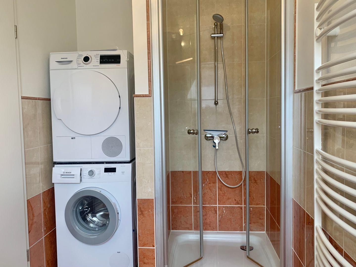 Helles Wohnzimmer, moderne Küche, Gäste-WC mit Dusche, ein separates Schlafzimmer mit 2