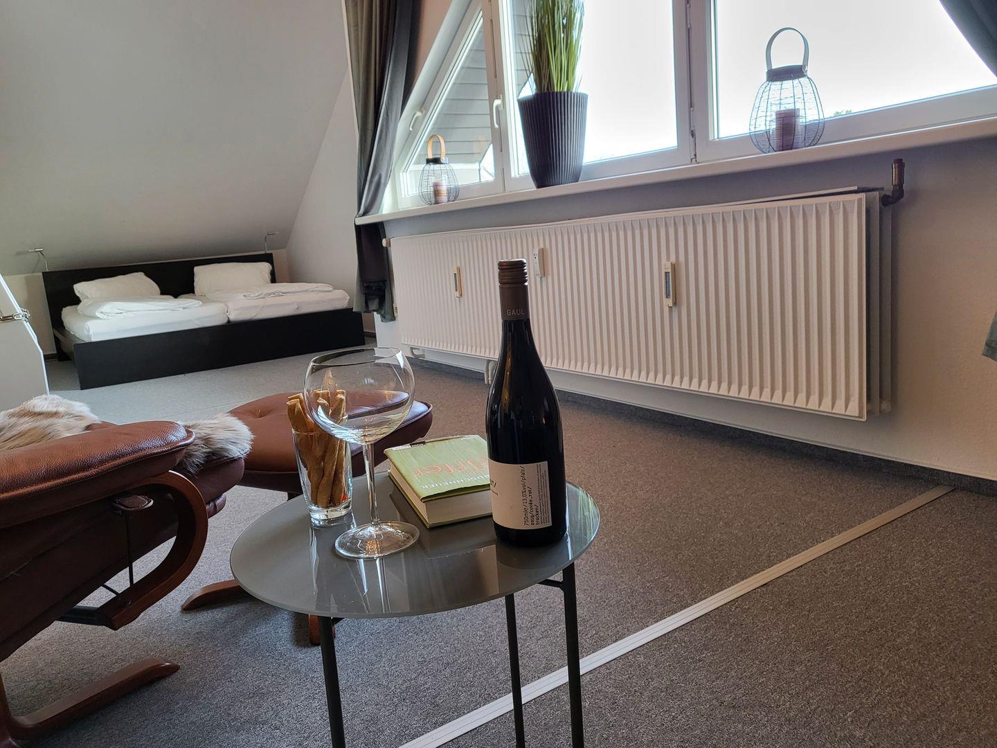 Moderne 3-Zimmerwohnung im Dachgeschoss des Hauses Loreley. Geräumiger Wohnraum mit gemütliche Sitzgruppe bestehend Sofa und zwei Relaxsessseln sowie Küchenzeile und Esstisch. Wannenbad mit WC, ein separates Schlafzimmer mit Doppelbett, ein offenes Schlafzimmer mit Doppelbett. Nichtraucherwohnung, keine Tierhaltung, PKW-Stellplatz vorhanden-