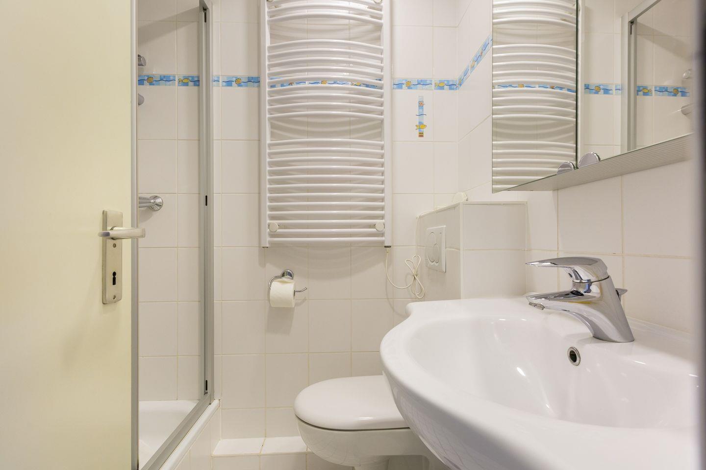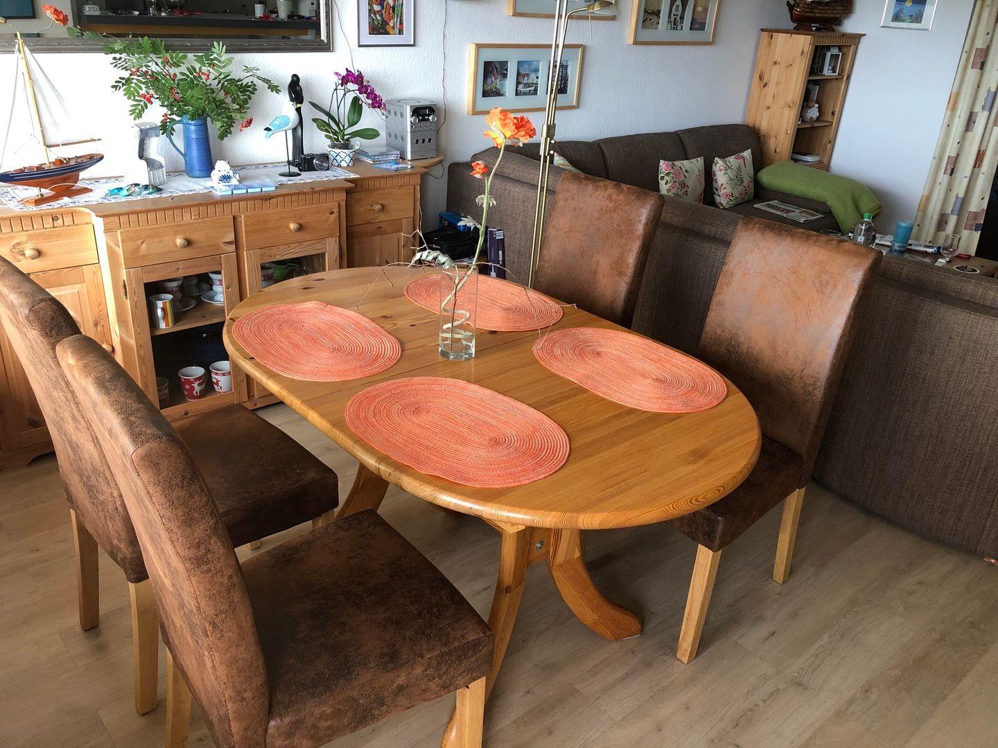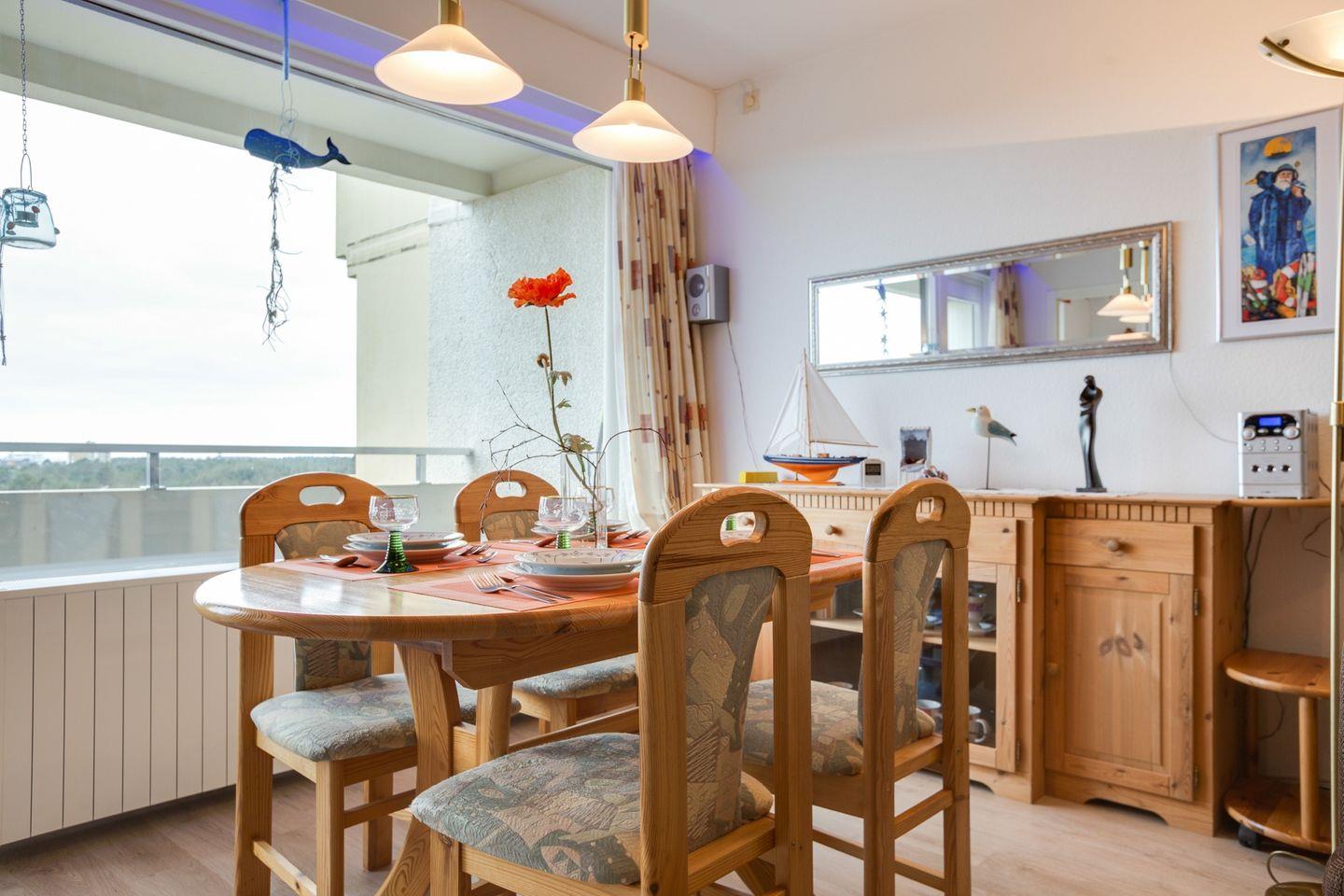 Durch die große Fensterfront und den Übergang zum Balkon wirkt der Wohnraum hell und einladend. Zur Ausstattung gehört eine einladende Sitzgruppe, direkt an der Fensterfront ist der Essbereich eingerichtet. Für die multimediale Unterhaltung sorgen Flachbild-TV und kostenfreies W-LAN, zudem steht eine Auswahl an DVDs, Büchern und Brettspielen für Feriengäste bereit. Die angrenzende Küche ist unter anderem mit Cerankochfeld und Backofen sowie Kühlschrank mit Gefrierfach, Mikrowelle und Geschirrspüler ausgestattet. Zur Ferienwohnung im Ortsteil Bad gehören zwei Schlafzimmer. Eines ist zum Wohnzimmer hin offen und mit zwei Einzelbetten ausgestattet, im zweiten Schlafzimmer steht ein Doppelstockbett bereit. Die Stockbetten sind mit den Maßen 90x190 für Kinder ausgelegt, können jedoch bei kompatibler Körpergröße auch problemlos von Erwachsenen genutzt werden. Die Ferienwohnung ist ausgestattet mit Duschbad und WC.