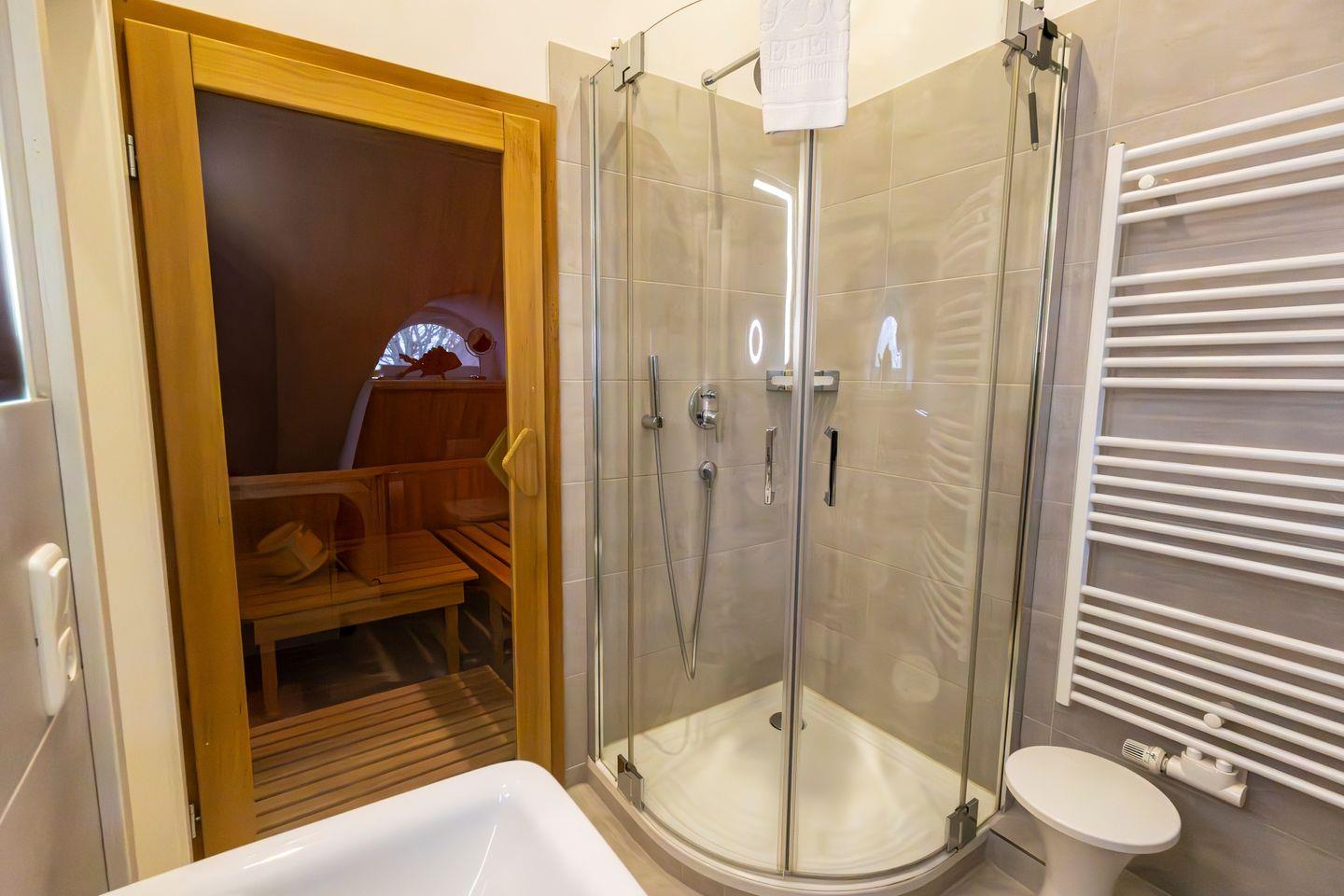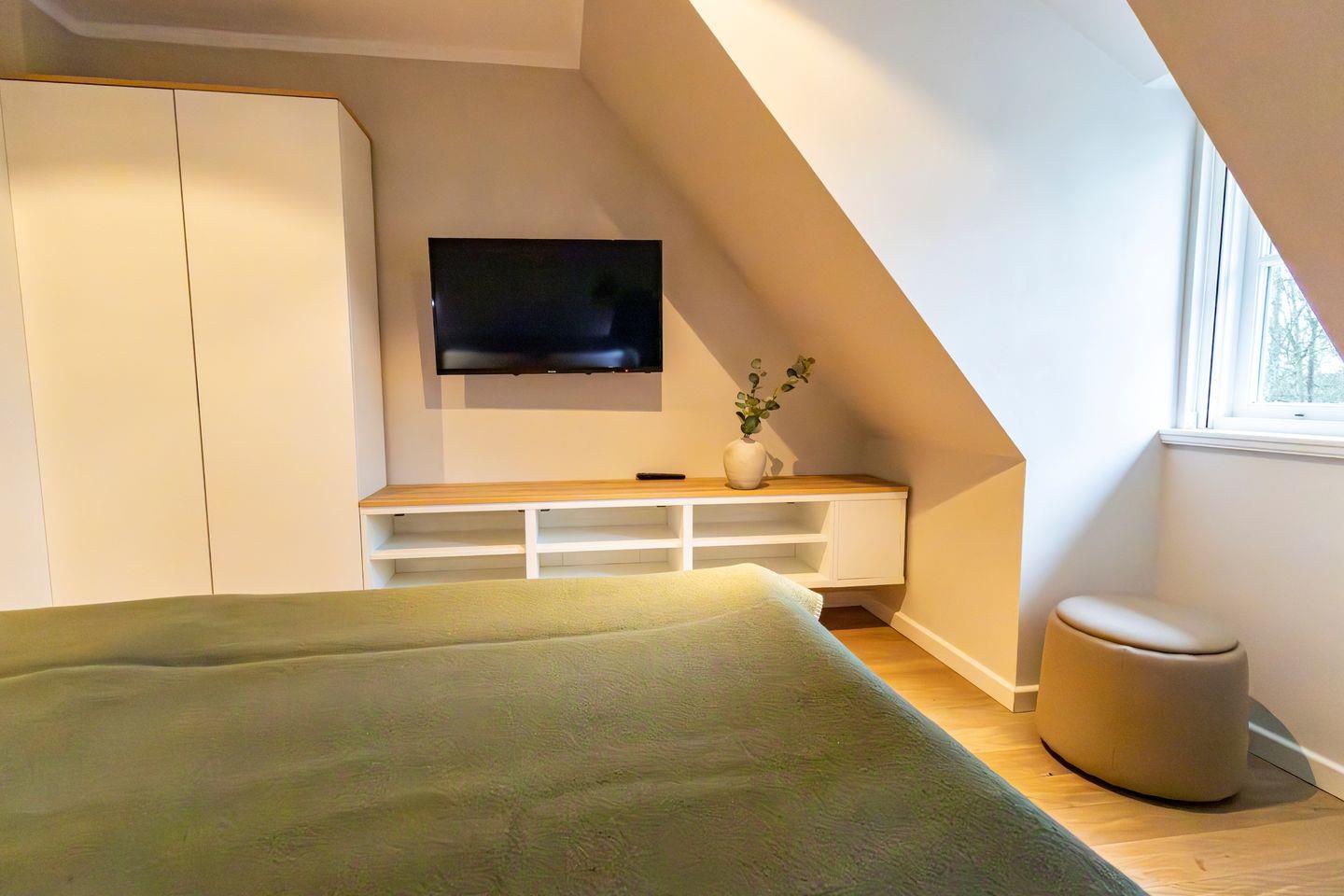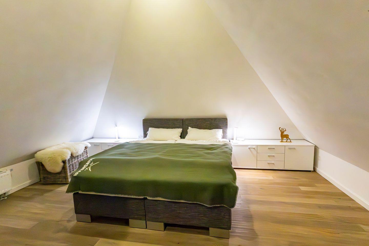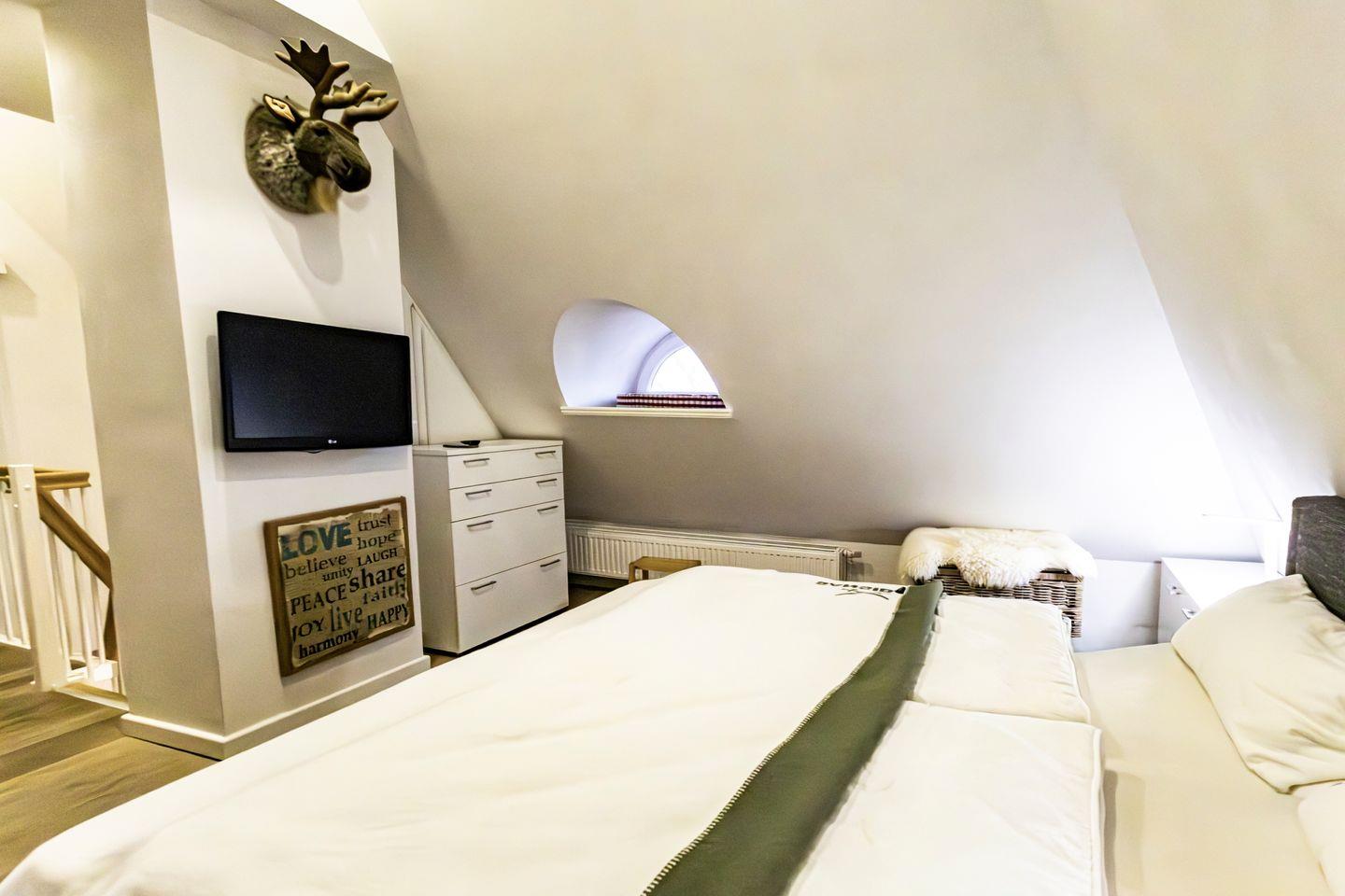 Dachgeschoss: ein Schlafzimmer mit Doppelbett (180 x 200 cm - durchgehender Topper) und TV, ein Duschbad / WC mit Sauna