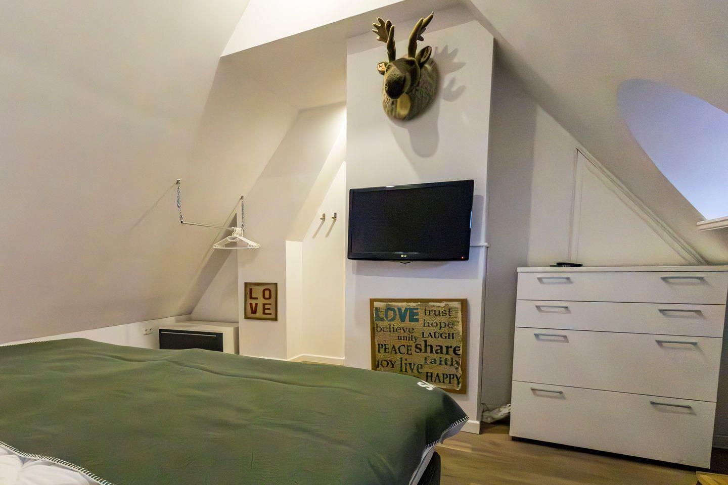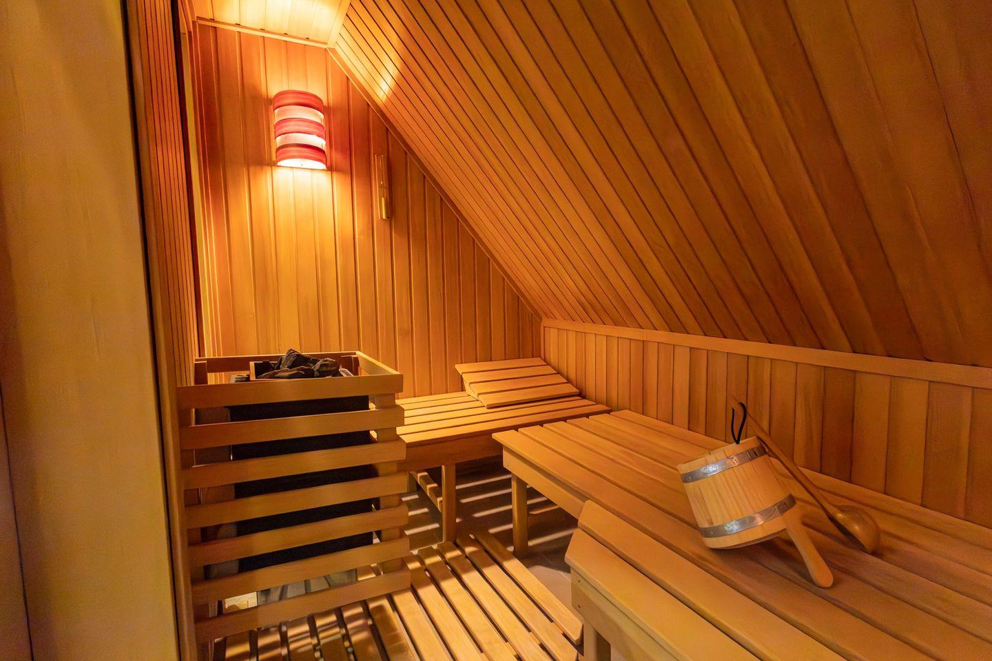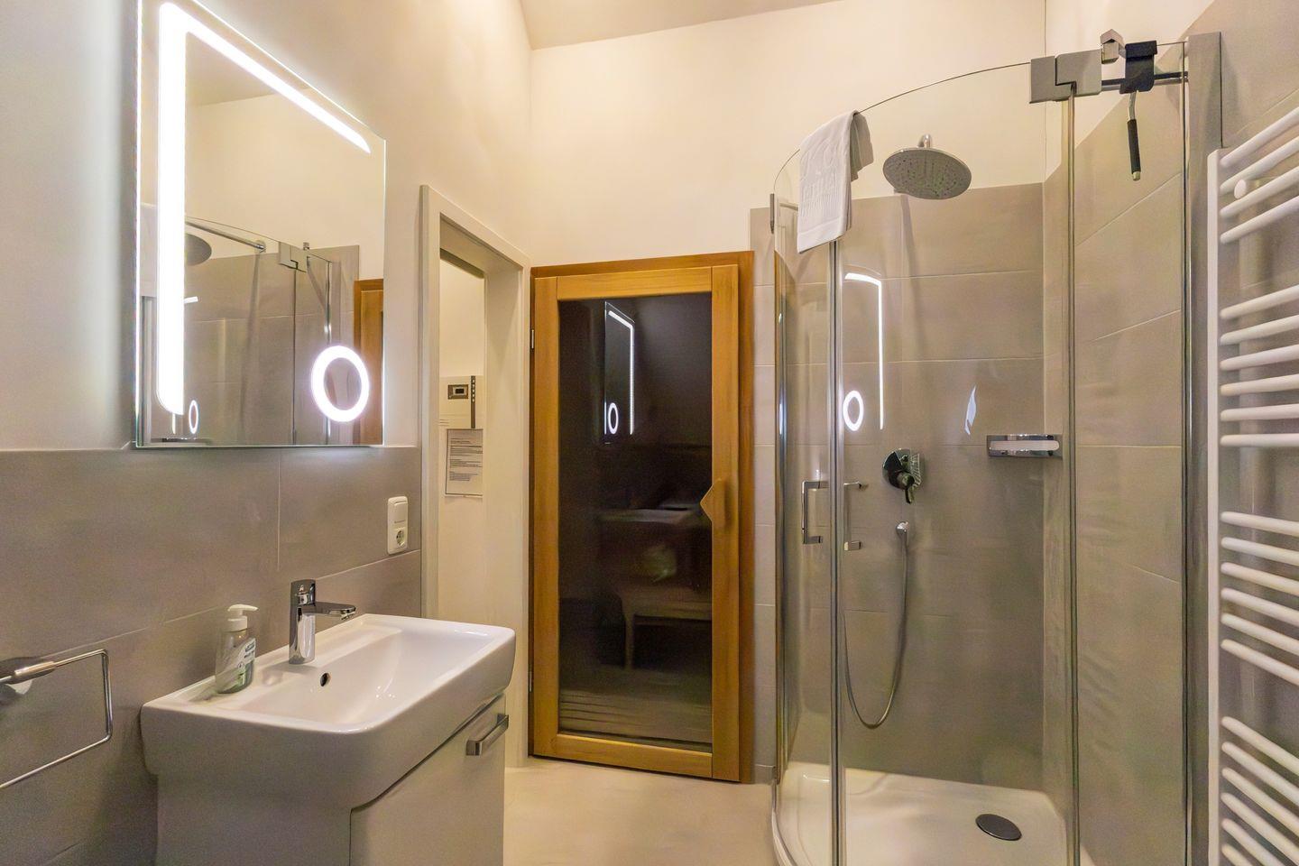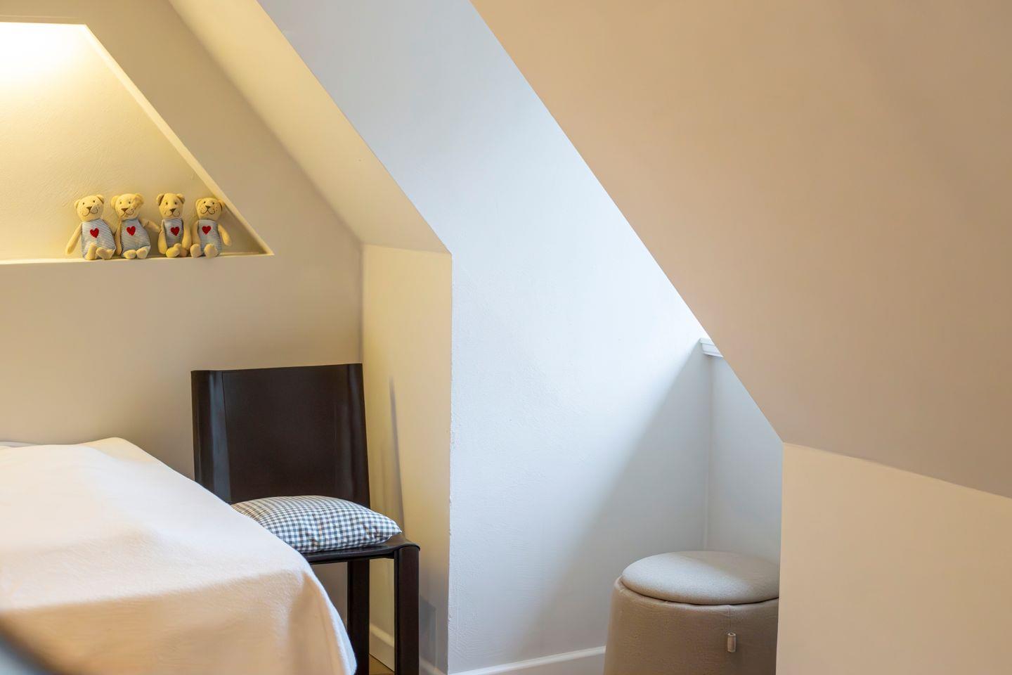 Dachgeschoss: ein Schlafzimmer mit Doppelbett (180 x 200 cm - durchgehender Topper) und TV, ein Duschbad / WC mit Sauna