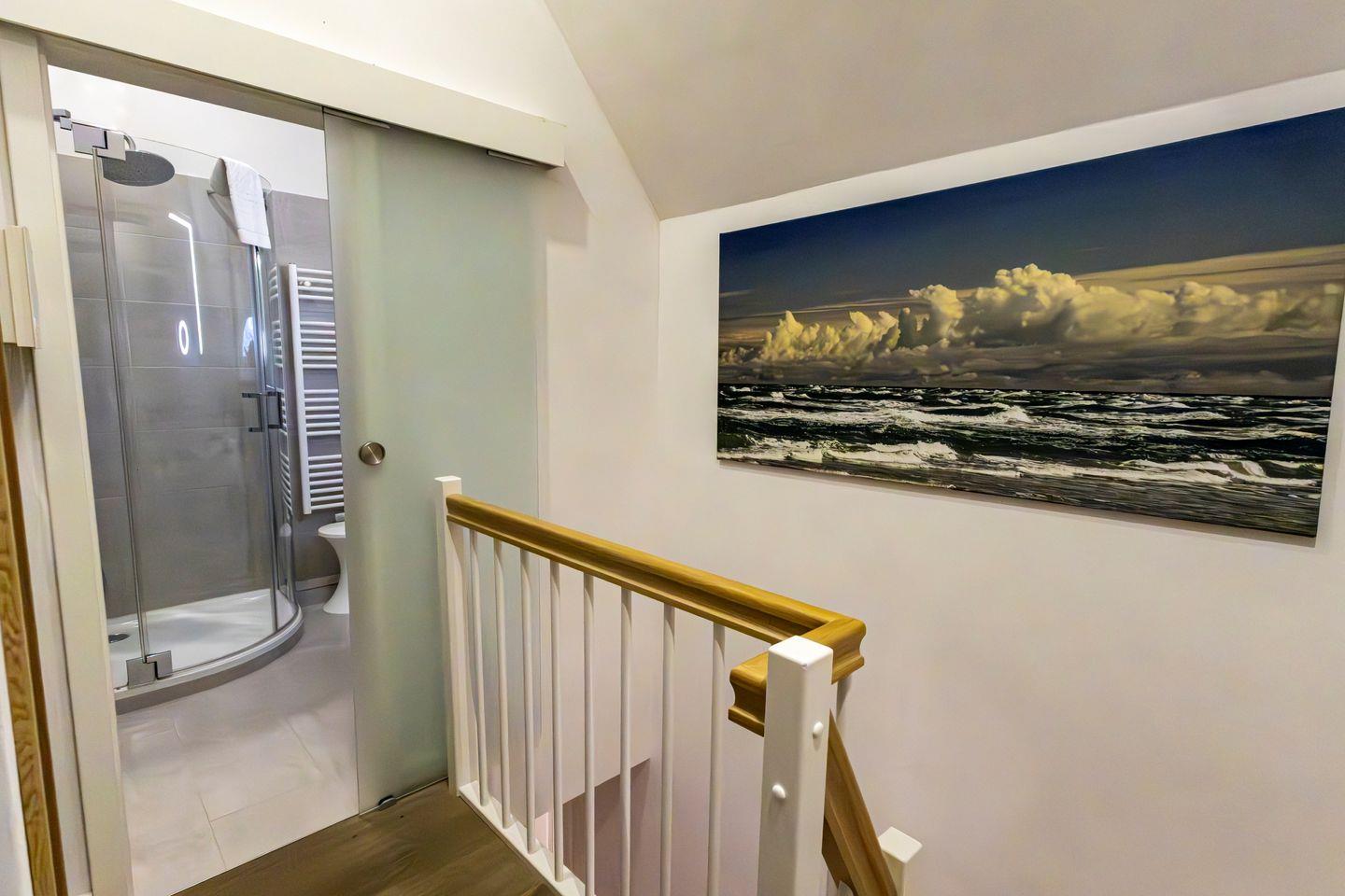 Obergeschoss: Eingangsbereich, Wohnraum mit integrierter Küche, Essbereich, Kamin und Zugang zum Balkon, ein Schlafzimmer mit Doppelbett (180 x 200 cm - durchgehender Topper) und TV, ein Schlafzimmer mit Einzelbett (140 x 200 cm - durchgehende Matratze) und TV, ein Duschbad / WC mit ebenerdiger Dusche