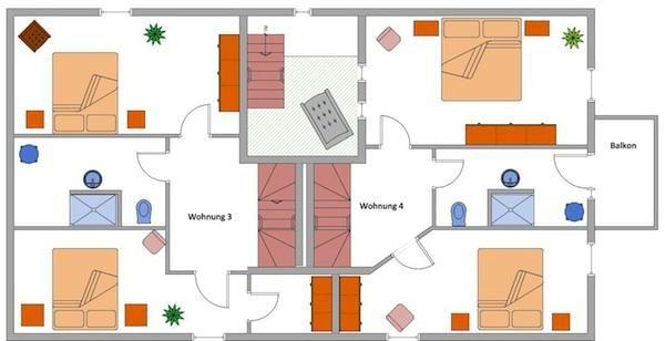 Obergeschoss: ein Schlafzimmer mit Boxspringbett (180 x 200 cm - durchgehender Topper) und begehbarem Kleiderschrank, ein Schlafzimmer mit Boxspringbett (180 x 200 cm), ein Duschbad / WC mit Zugang zum Balkon (Nordausrichtung)