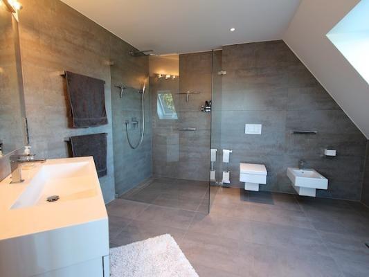 Obergeschoss: eigener Eingangsbereich, Wohnraum mit offener Küche, Essbereich und Zugang zu den 3 Balkonen, ein Schlafzimmer mit Doppelbett (200 x 200 cm), Ankleideraum, zweiseitig umlaufendem Balkon und angegliedertem Duschbad / WC mit ebenerdiger Dusche und Bidet