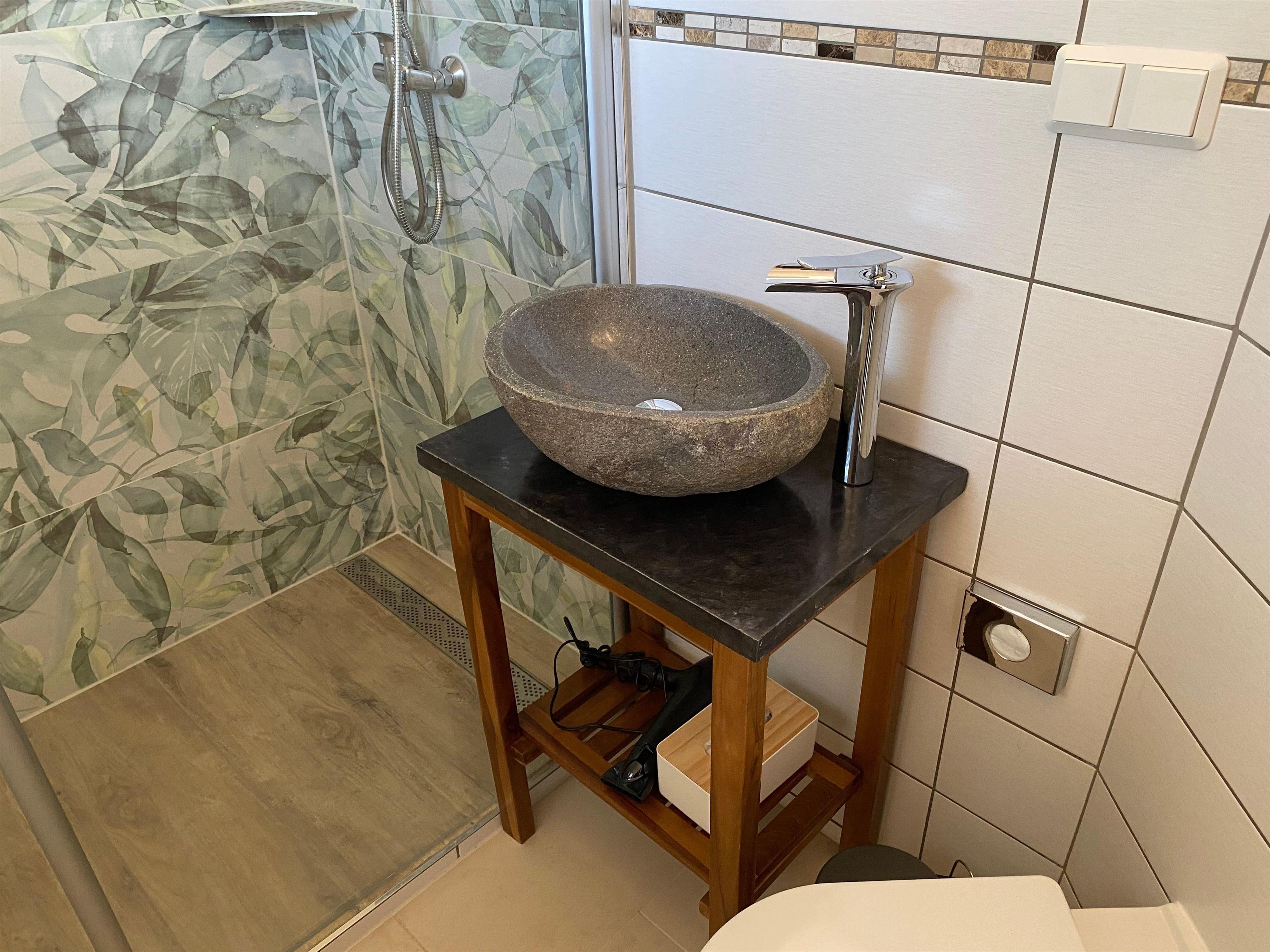 Im Bad, ausgestattet mit WC, Waschbecken und Dusche, stehen unseren Gästen auch ein Haartrockner, Handwaschseife und Kosmetiktücher zur Verfügung.