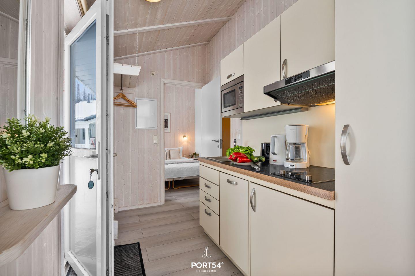 Die angrenzende, kompakte Küche ist vollständig ausgestattet und bietet alles, was du benötigst, um leckere Mahlzeiten zuzubereiten. Neben einem 2-Platten-Cerankochfeld stehen dir ein Kühlschrank mit Gefrierfach, eine Mikrowelle und eine Kaffeemaschine zur Verfügung. Der kleine, einladende Essbereich ist perfekt, um bei gemeinsamen Mahlzeiten und langen Gesprächen die Erlebnisse des Tages Revue passieren zu lassen.