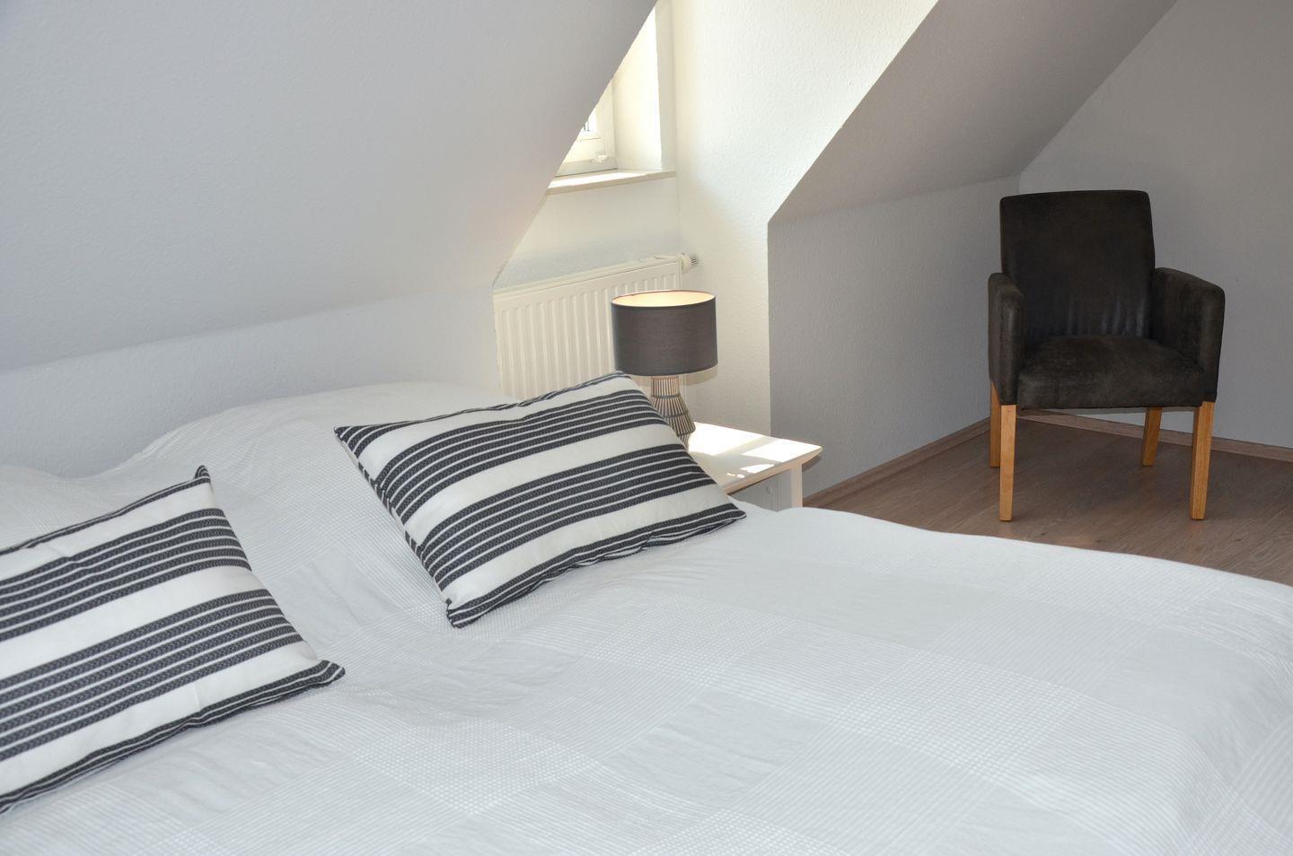 Über eine Steintreppe gelangt man in das Obergeschoss. Die beiden Schlafzimmer, mit je einem Doppelbett bieten ruhevolle Erholung. Darüber hinaus befindet sich im Obergeschoss ein Bad mit Dusche. Über eine weitere Holztreppe gelangen Sie ins Dachgeschoss, dort stehen Ihnen noch zwei weitere Einzelbetten zur Verfügung. In den Schlafräumen sind Fliegengitter angebracht.