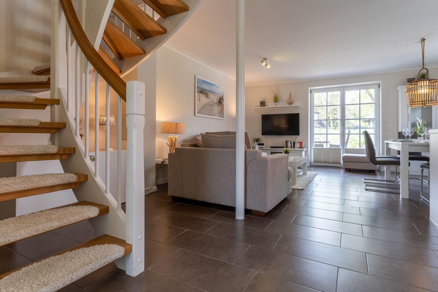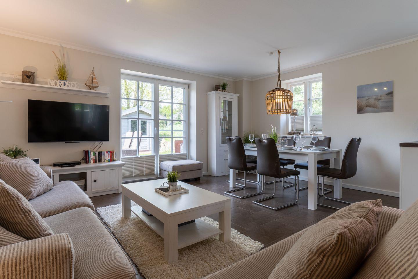 Im Erdgeschoss befindet sich der lichtdurchflutete Wohnraum mit TV sowie einem Essbereich.