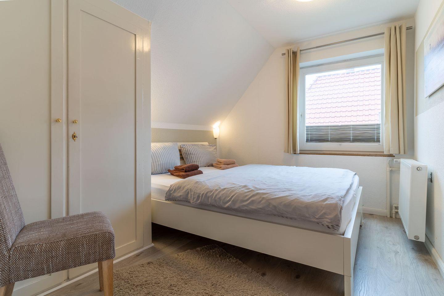 Das Schlafzimmer ist mit einem bequemen Doppelbett (200 x 160 cm) ausgestattet und sorgt für einen erholsamen Schlaf. Die Fenster sind mit Plissees verdunkelt. Das Tageslicht-Duschbad mit WC ist funktional eingerichtet. Auf dem nach Süden ausgerichteten Balkon oder im Garten mit Strandkorb können Sie die Sonne und frische Luft genießen.