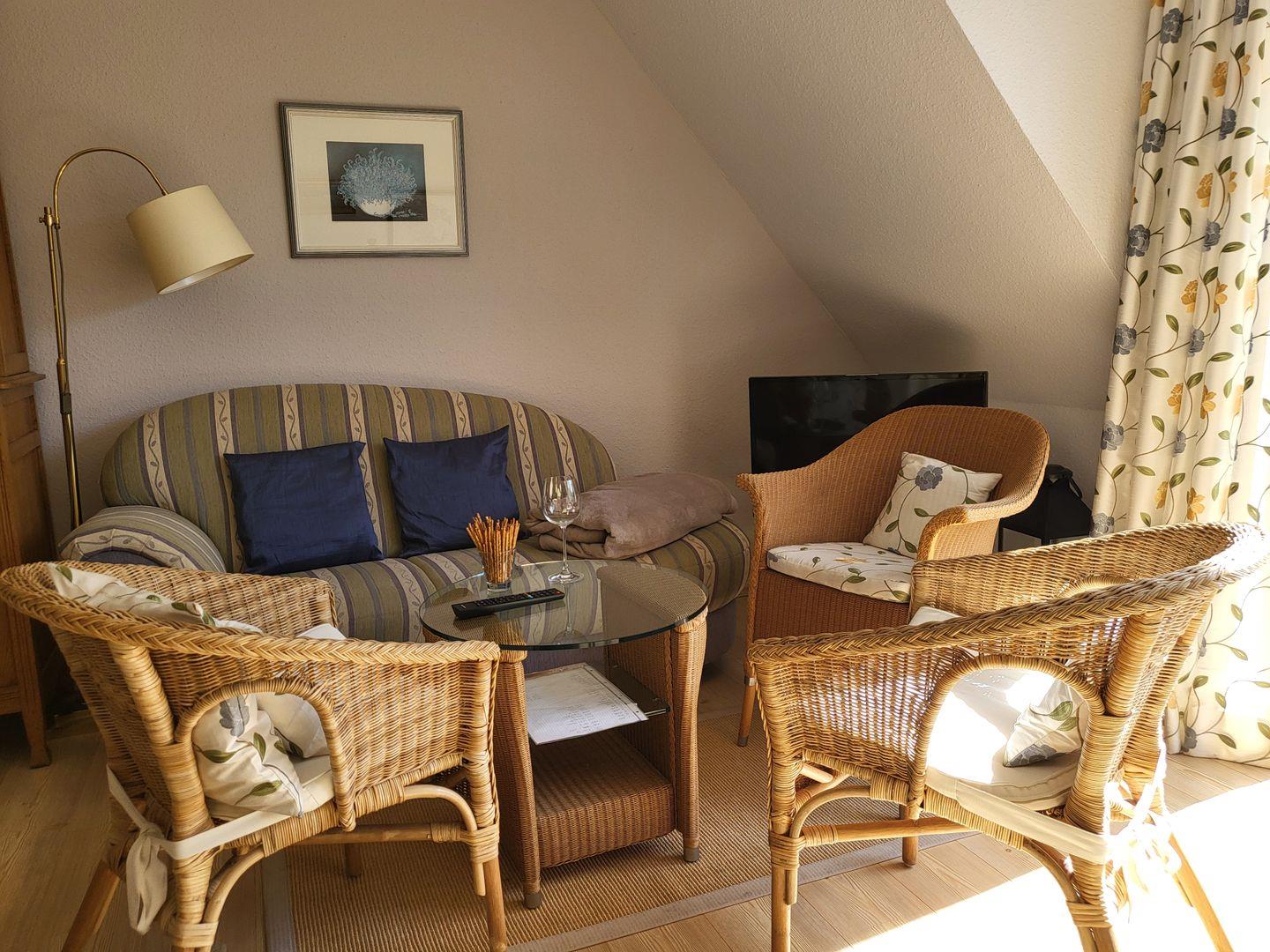 Neben einer gemütlichen Sitzecke gehören hier der Esstisch und ein Smart-TV zur Ausstattung.