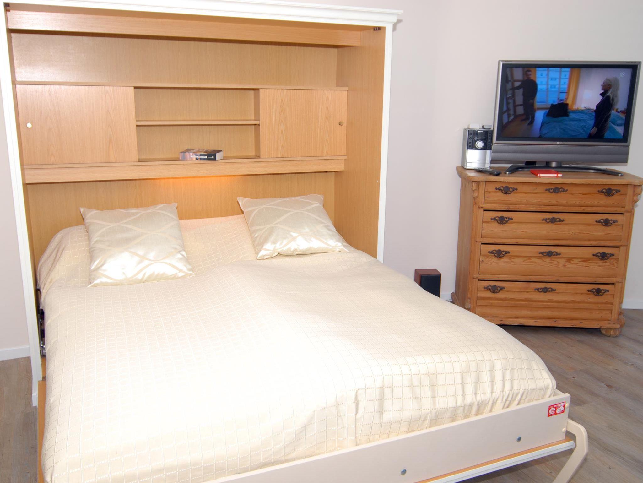 Wohnzimmer: Couch, Hocker Couchtisch, 2 Sessel, Stehlampe, Radio mit CD-Player, Kabel-TV, Flachbildschirm, Elektroheizung, Kleiderschrank, Kommode, Schrankdoppelbett 2 Matratzen 2,00 x 0,80 m, Staubsauger, Esstisch, 2 Stühle, Küchenzeile, 4 Plattenherd mit Ceranfeld, Dunstabzugshaube, Kühlschrank, Spülmaschine, Kaffeemaschine, Wasserkocher, Toaster, Mikrowelle, Geschirr, Kochtöpfe
