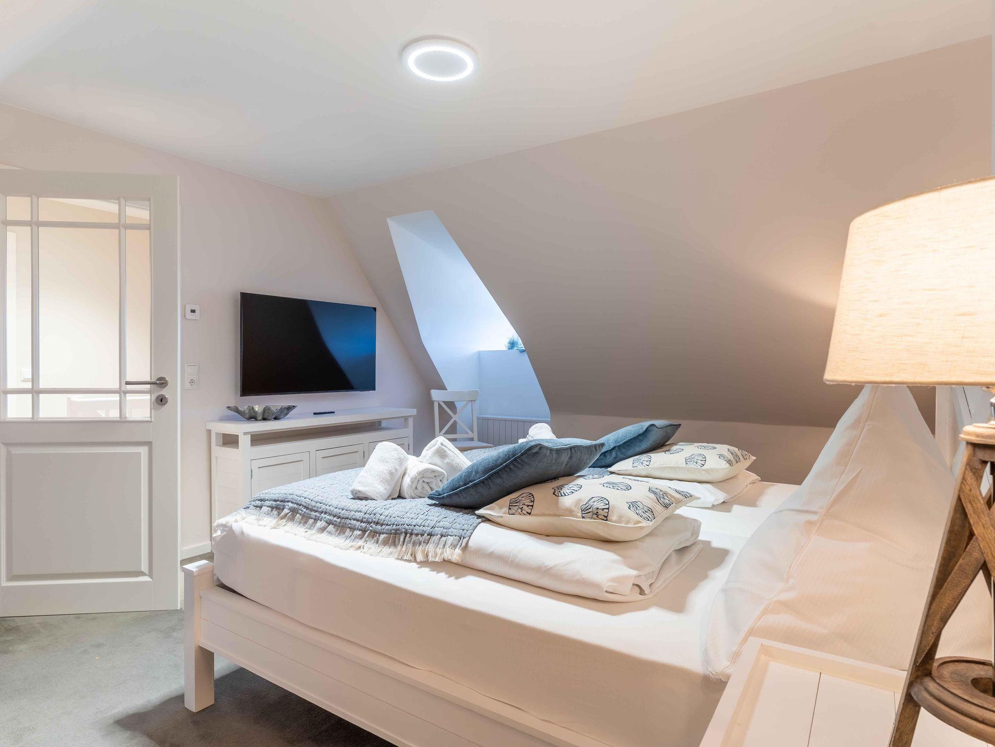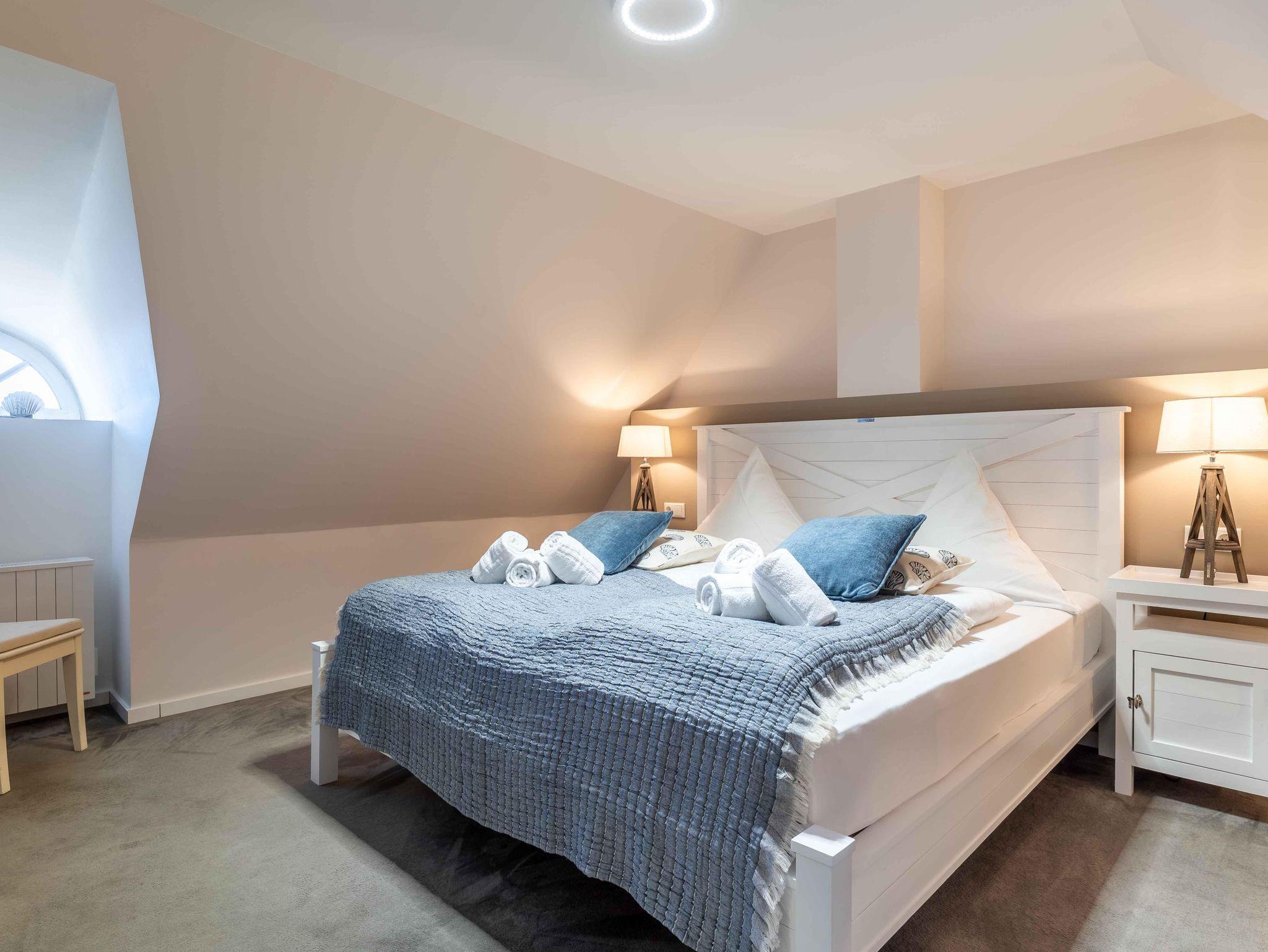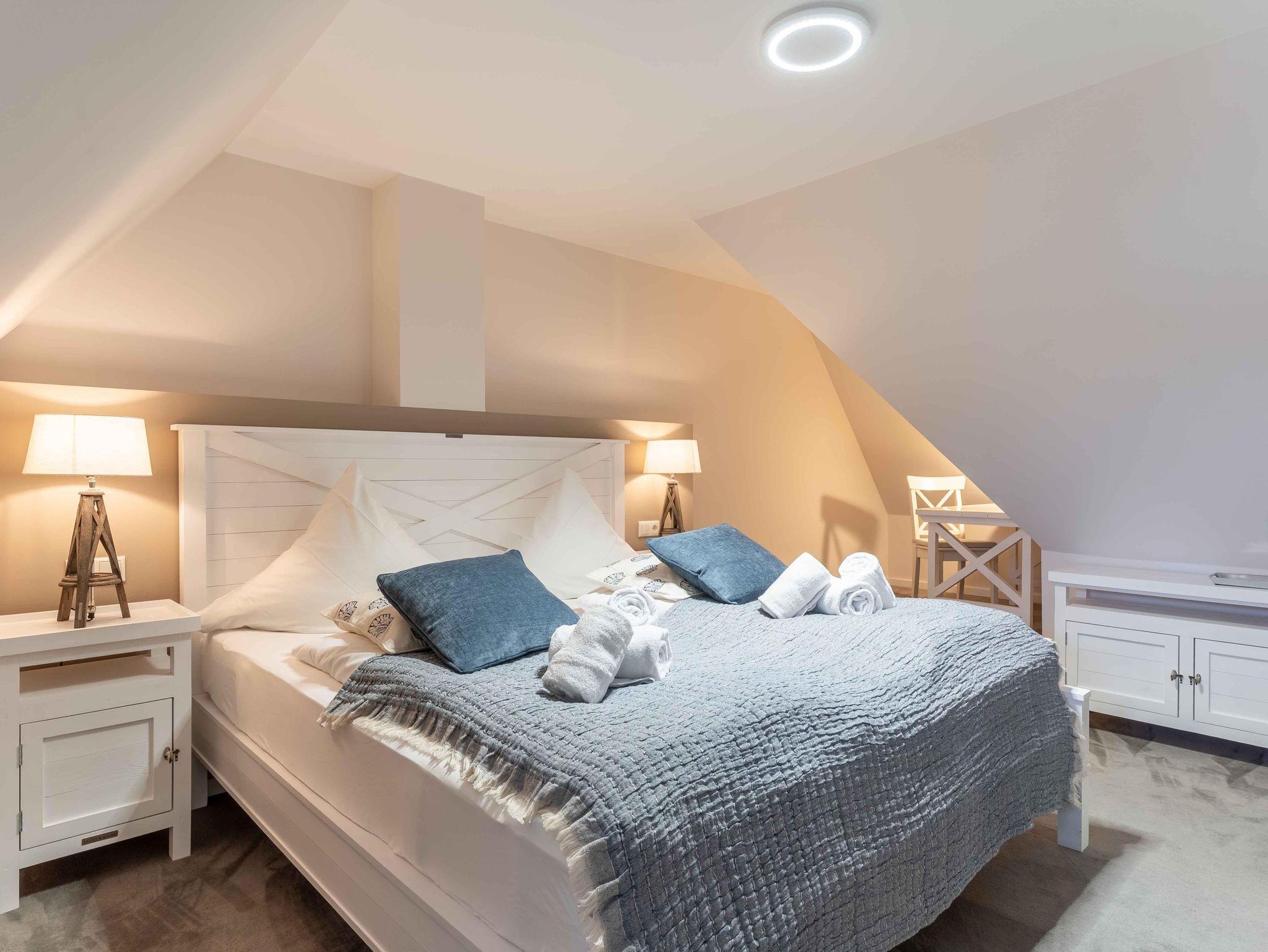 Die geräumige 3-Zimmer-Ferienwohnung Wattläufer Nr. 09 geht mit ihren 80 m² über die 1. Etage bis in das Dachgeschoss. Bis zu 4 Gäste können in dieser geschmackvoll eingerichteten Wohnung ihren Urlaub schön verbringen. Vom stillvollen und gemütlichen Wohnbereich treten sie heraus auf den sonnigen Süd-Balkon. Die schicke Küchenzeile mit modernem Cerankochfeld, Backofen verlockt zum Kochen. Sie können hier zwischen 2 Schlafzimmern mit je einem Doppelbett wählen. Es gibt ein schickes neues Bad im 1. OG und ein extra WC im DG.