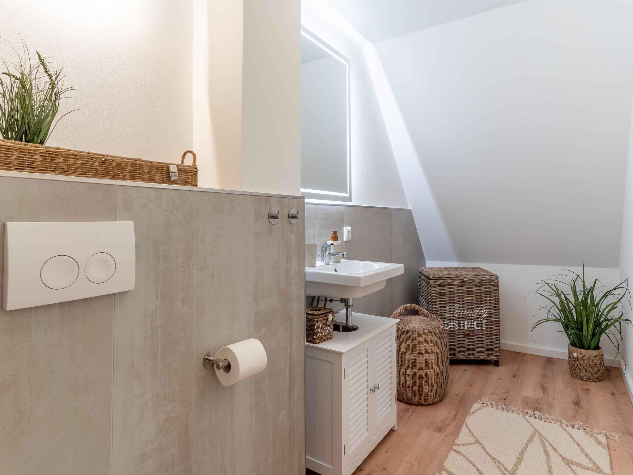 Gäste-WC: Waschbecken, WC, Anrichte, Stuhl, Wäscheständer