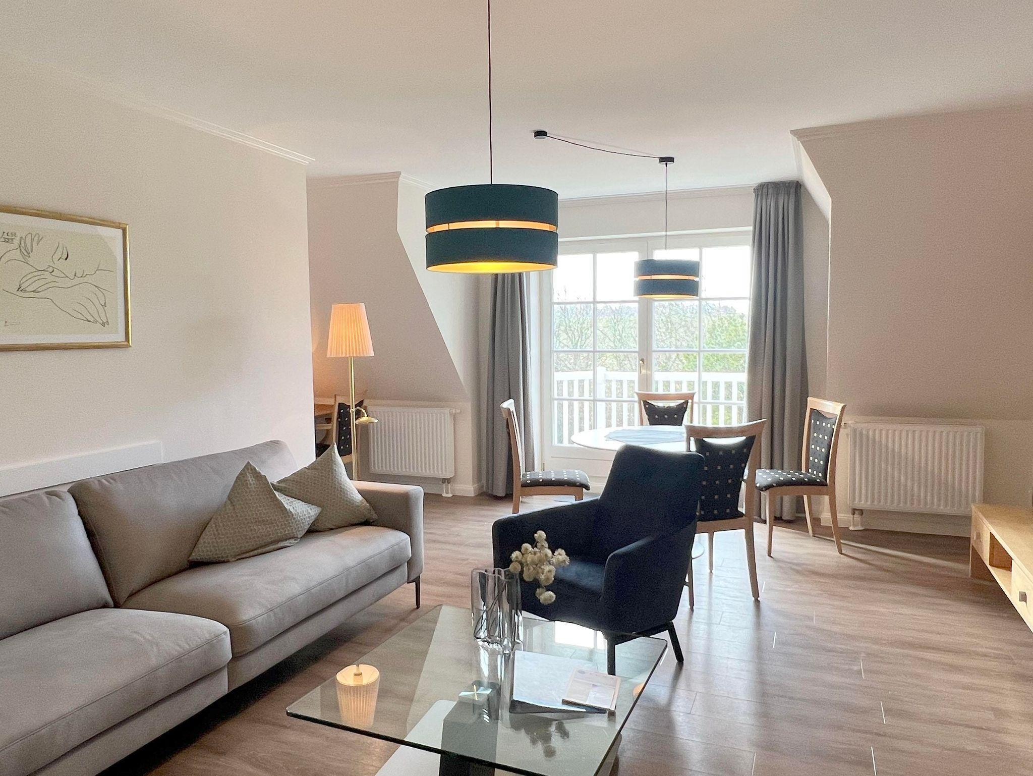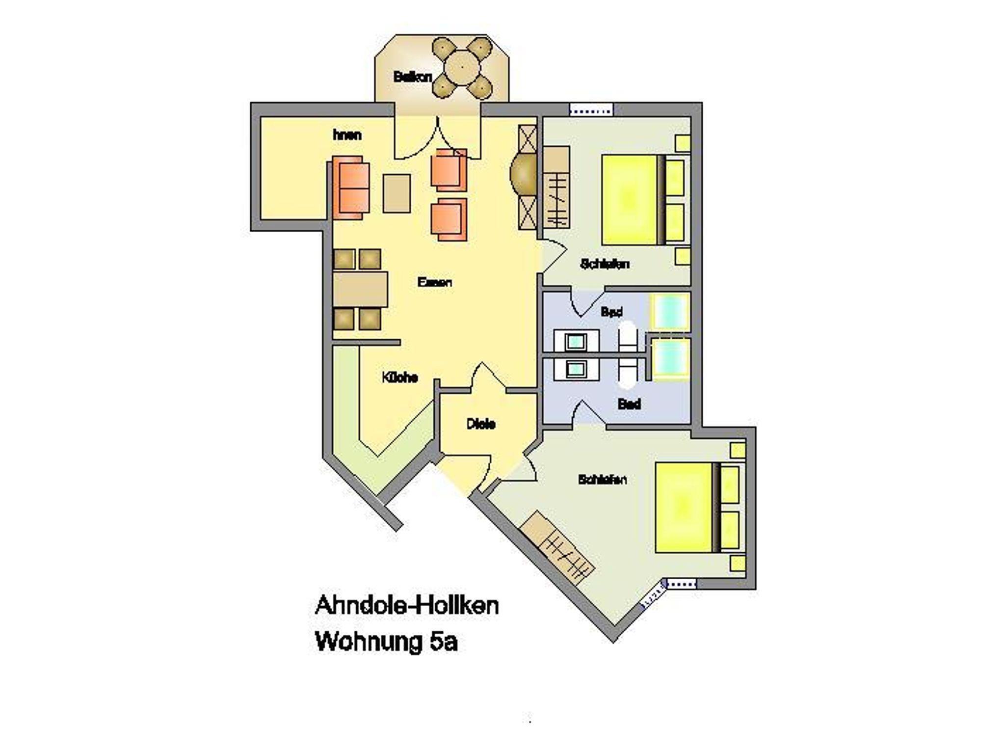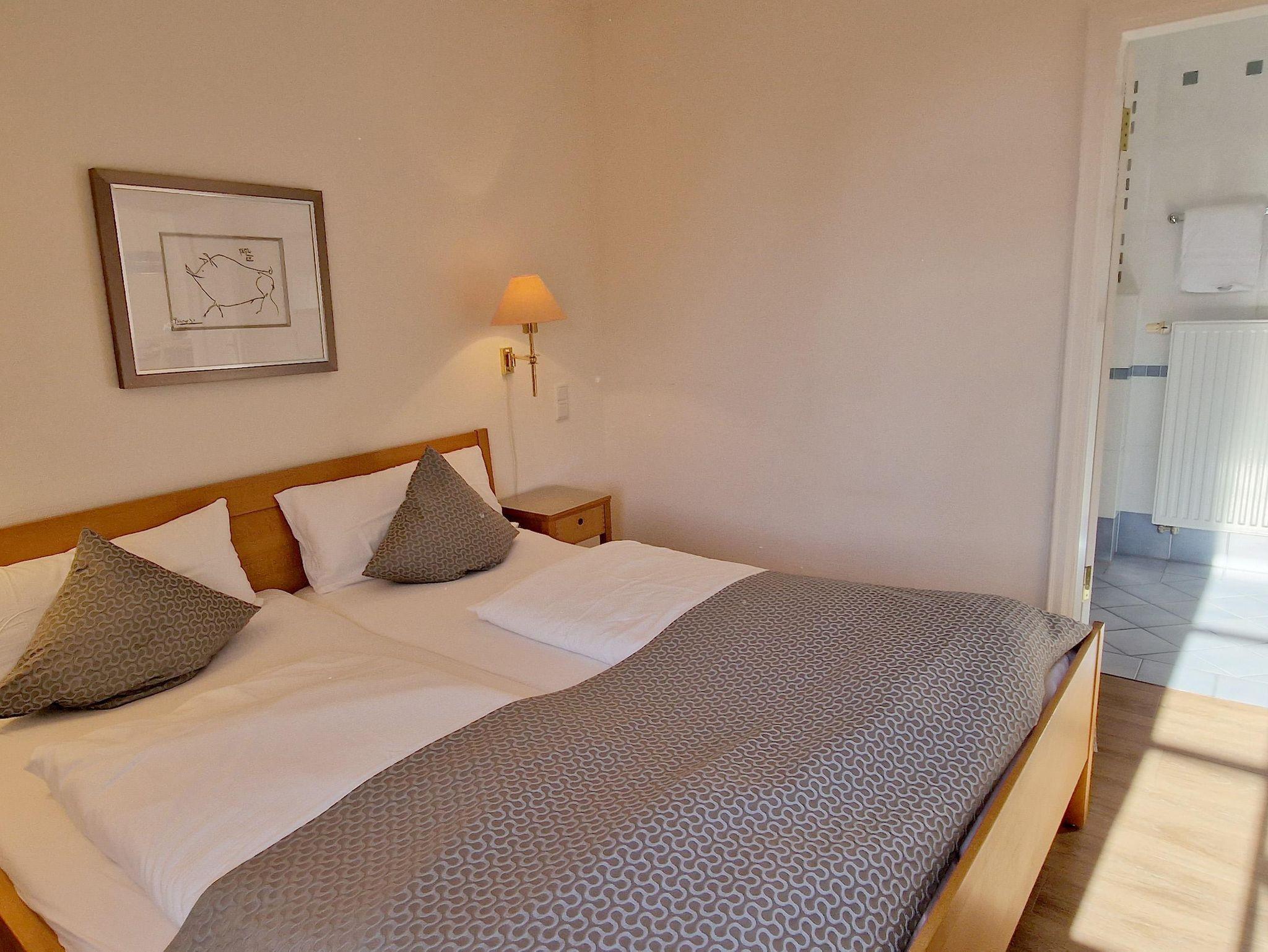 Eingangsbereich, Eingangsdiele mit Garderobe, großzügiger Wohn-Essbereich mit direktem Zugang auf einen Balkon mit Gartenmöbeln, zusätzlich im Dünengelände eine große, durch Friesenwälle und Gehölze abgeschirmte Terrasse mit Gartenmöbeln und einem Strandkorb. Zwei Schlafzimmer mit Doppelbetten, zwei Duschbäder/WC. Separate Küche. Im Untergeschoss befindet sich eine Gemeinschaftssauna (Ruheraum, verschiedene Duschen, Fußbäder), Fitnessraum, Tischtennis. Im Außenbereich: ein Spielplatz für die Kleinsten, Stellplatz, Fahrradständer.