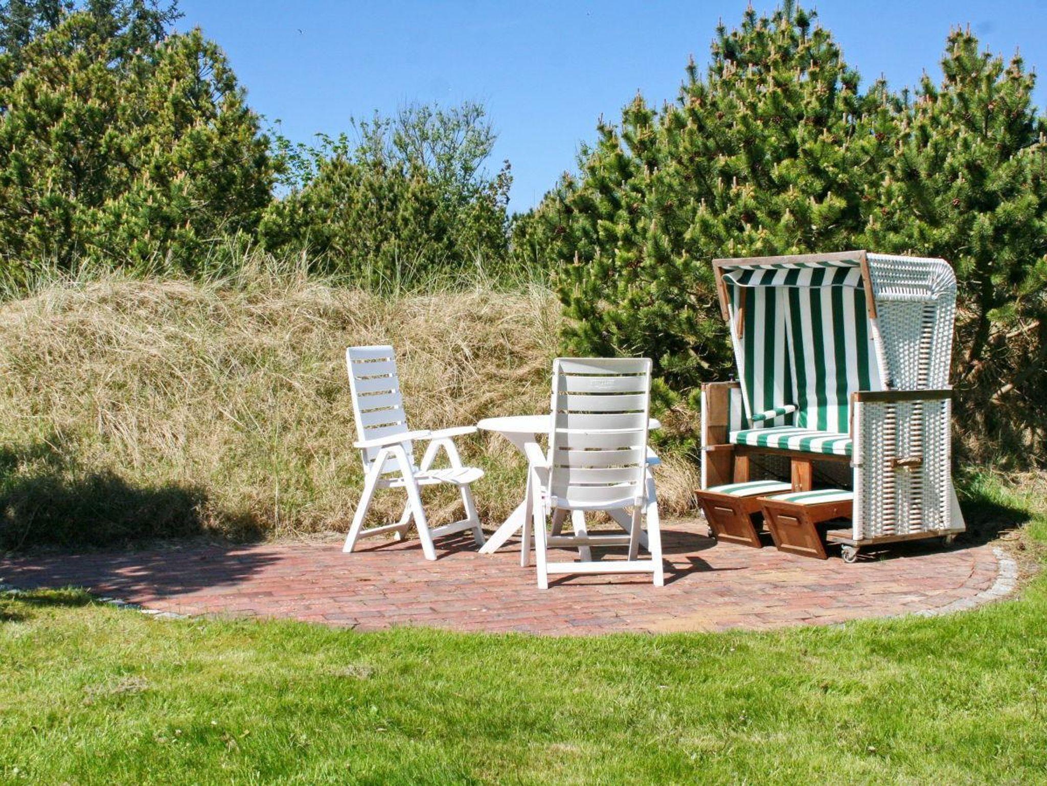 • Terrasse mit Gartenmöbeln und Strandkorb im Gartengelände umsäumt von Dünen.