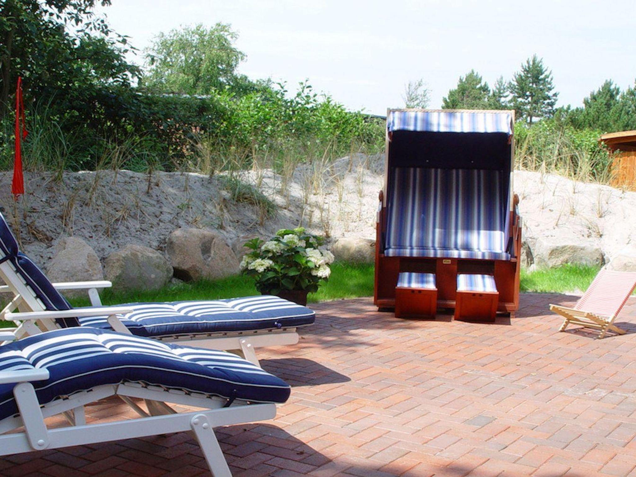 Gartenmöbel und ein Strandkorb laden Sie zur Erholung ein.