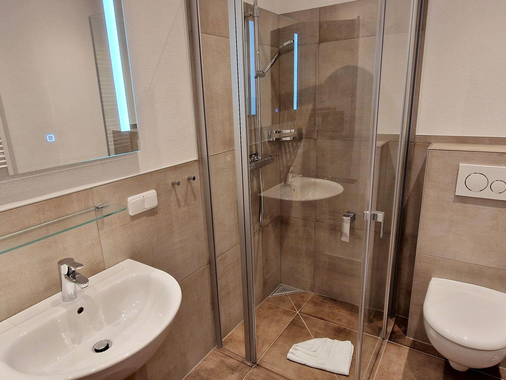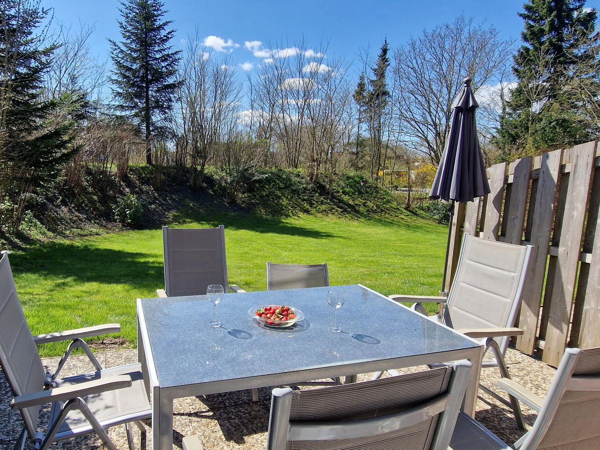 Das schöne Ferienmittelhaus hat in 3 Zimmern Platz für 4 Gäste und einen Hund bis 40 cm Schulterhöhe. Im EG genießen Sie das moderne, gemütliche Wohnzimmer mit dem offenen Kamin. Treten Sie von dort auf die sonnige Süd-Terrasse, auf der Sie herrlich grillen können. Die Küchenzeile ist u.a. mit einem 4-Plattenherd und Backofen ausgestattet. Auch ein Gäste-WC gibt es hier unten. Im Abstellraum steht eine Waschmaschine für Sie bereit. Oben laden 2 Schlafzimmer zur Nachtruhe mit je 1 Doppelbett und 2 Einzelbetten ein. Hier befindet sich auch das Bad.