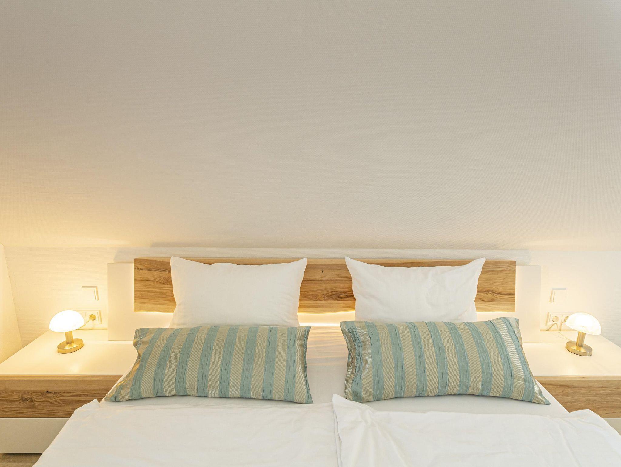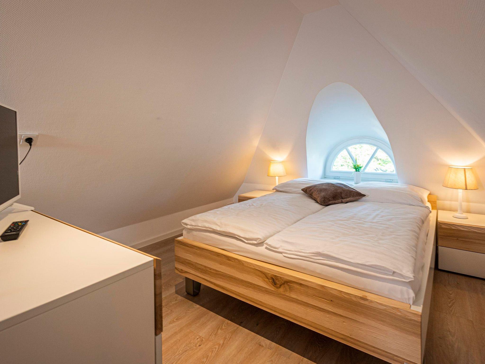 Im Dachgeschoss des KOELLER Hus befindet sich ein weiteres Doppelbett romantisch unter dem Giebel gelegen. Außerdem findet sich hier unter dem Dach ein weiterer kleiner Aufenthaltsbereich zum Sitzen, Spielen und Entspannen, sodass wirklich jeder in diesem Haus einen ganz eigenen Wohlfühlort finden kann und man auch mit acht Personen genug Freiraum findet.
