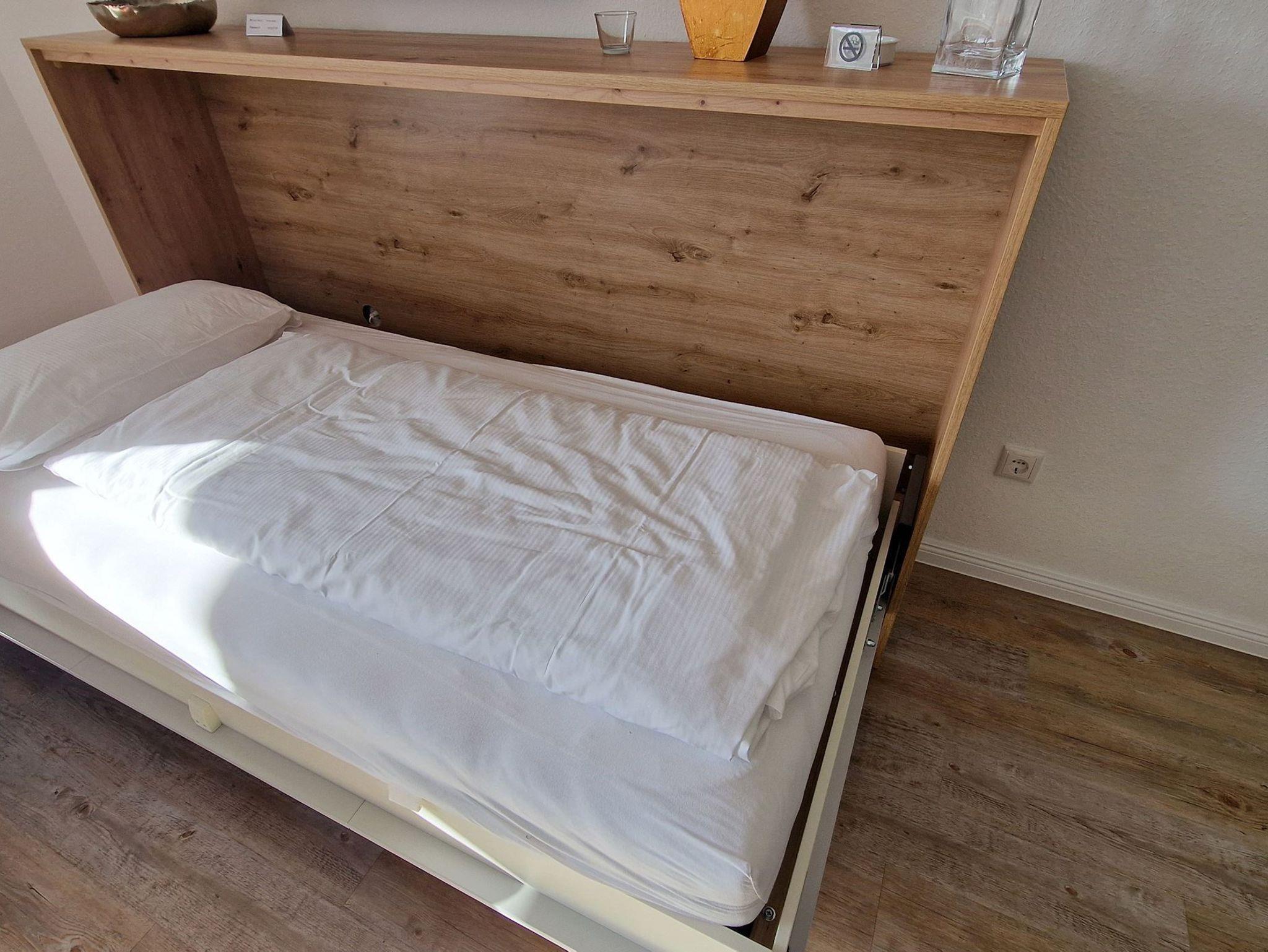 Sie teilt sich wie folgt auf: Eingangsdiele mit Garderobe, Schlafzimmer mit Doppelbett, Duschbad mit WC. Der großzügige Wohnraum mit direktem Zugang zur Terrasse und Garten überzeugt mit seiner gemütlichen Sitzecke mit direktem Blick nach draußen, moderne, weiße Küche, Essecke und als weitere Schlafmöglichkeit 1 Doppelschrankbett. Die Fußböden der Ferienwohnung sind aus Designerparkett oder Fliesen, Allergikergeeignet.
