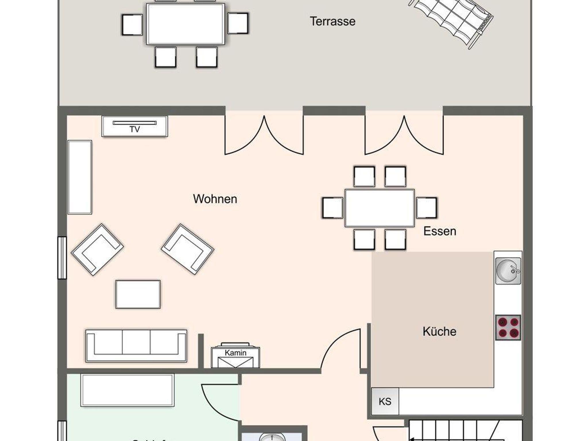 Im Erdgeschoss befindet sich der Wohnraum mit einer offenen Küche und einem gemütlichen Essbereich. Die Küche ist mit nützlichen Geräten voll ausgestattet.