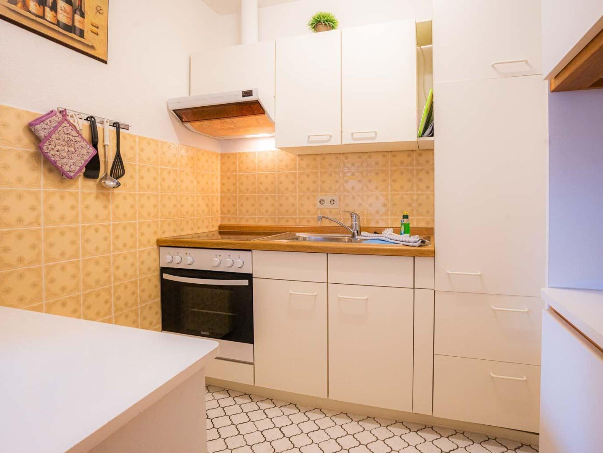 Wohnzimmer mit Schrank-Einzelbett (90x200cm), Entspannungssessel, TV und Tisch mit 3 Stühlen. Kleine, zum Wohnzimmer halboffene Küche mit Backofen und Kühlschrank mit Gefrierfach.