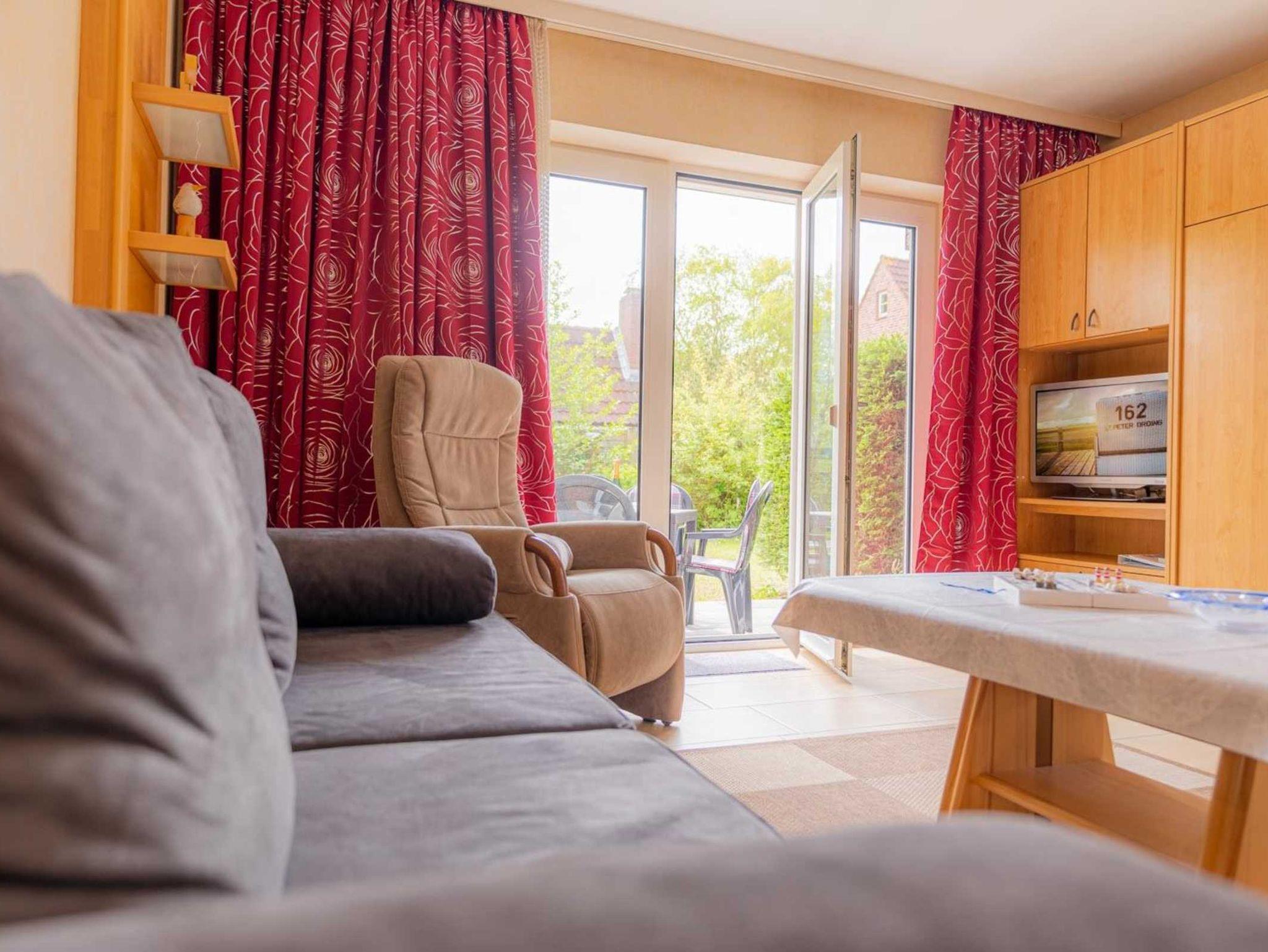 Wohnzimmer mit Sofa, Sessel, TV (Sat), ausklappbarem Schrank-Doppelbett (2x 80x200cm) und Esstisch mit 4 Stühlen. Direkter Zugang zur möblierten Gartenterrasse nach Süden. Kleine halboffene Küche mit Backofen, Mikrowelle, Geschirrspüler und Kühlschrank mit Gefrierfach.