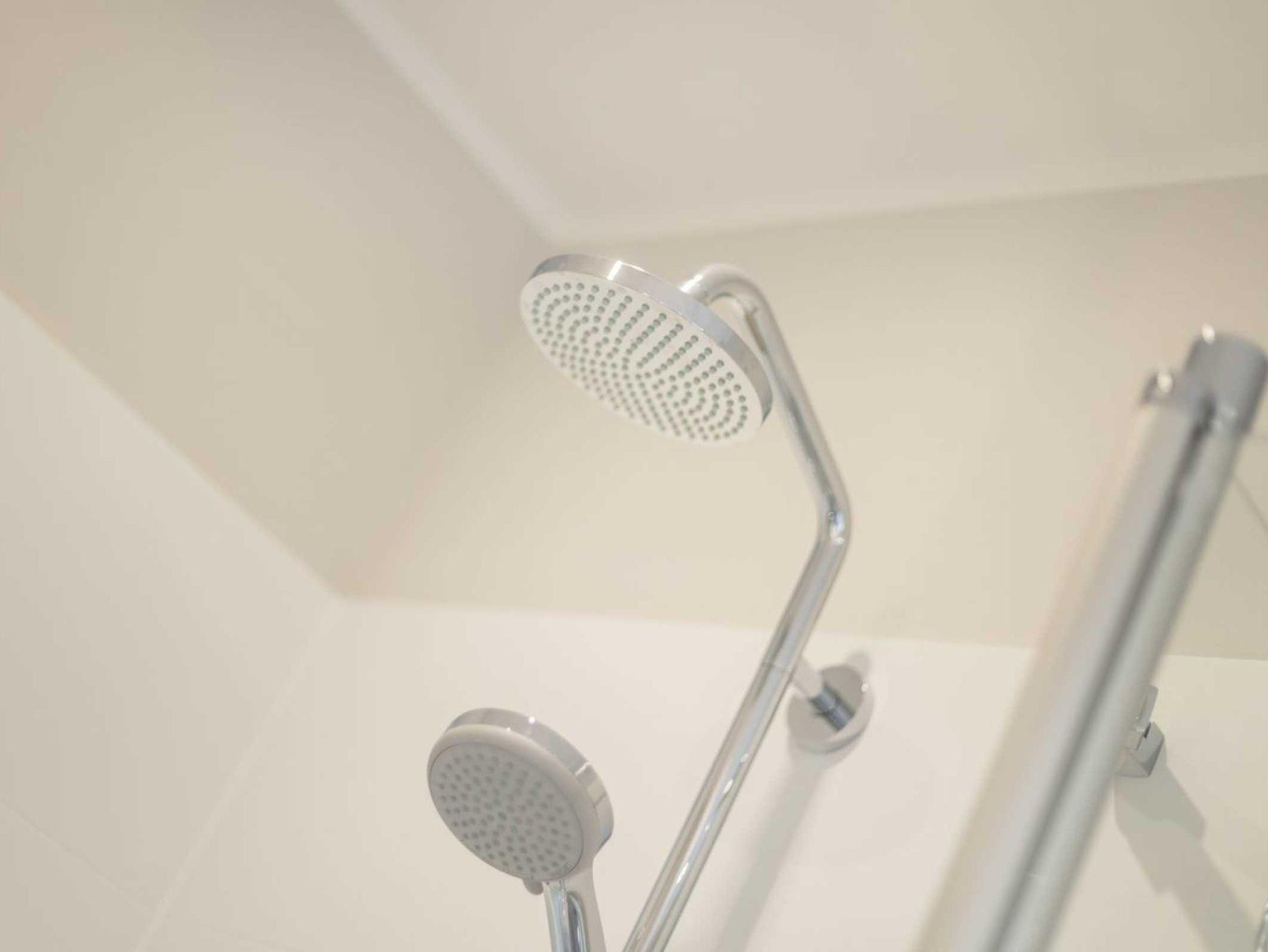 2. Badezimmer (Duschbad) mit bodengleicher Dusche, WC, Handtuchwärmer, Tageslicht und Kosmetikspiegel.