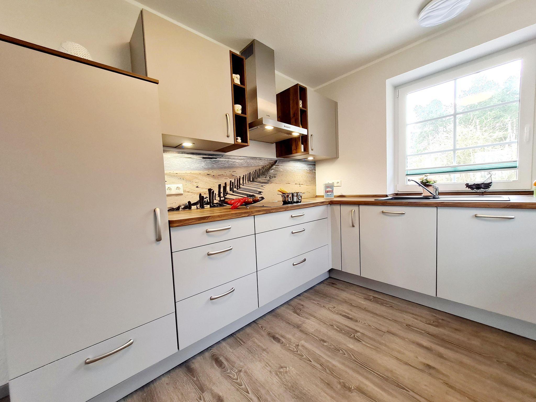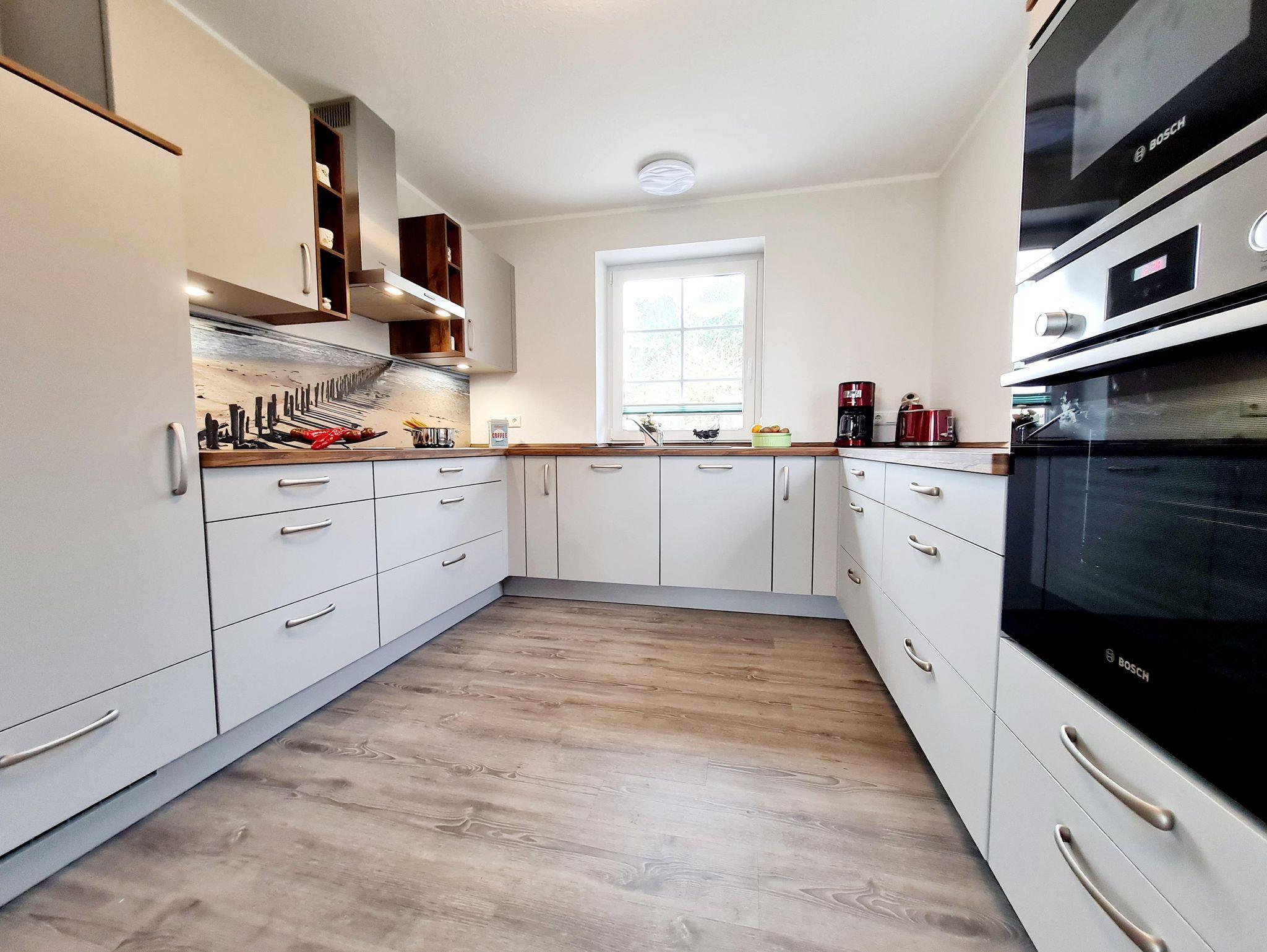 Die Küche ist komplett mit Herd (Cerankochfeld, 4 Flammen), Backofen, Mikrowelle, Geschirrspüler und Kühlschrank ausgestattet. Selbstverständlich sind Kaffeemaschine, Kaffeekapselmaschine (Nespresso), Wasserkocher und Toaster vorhanden.