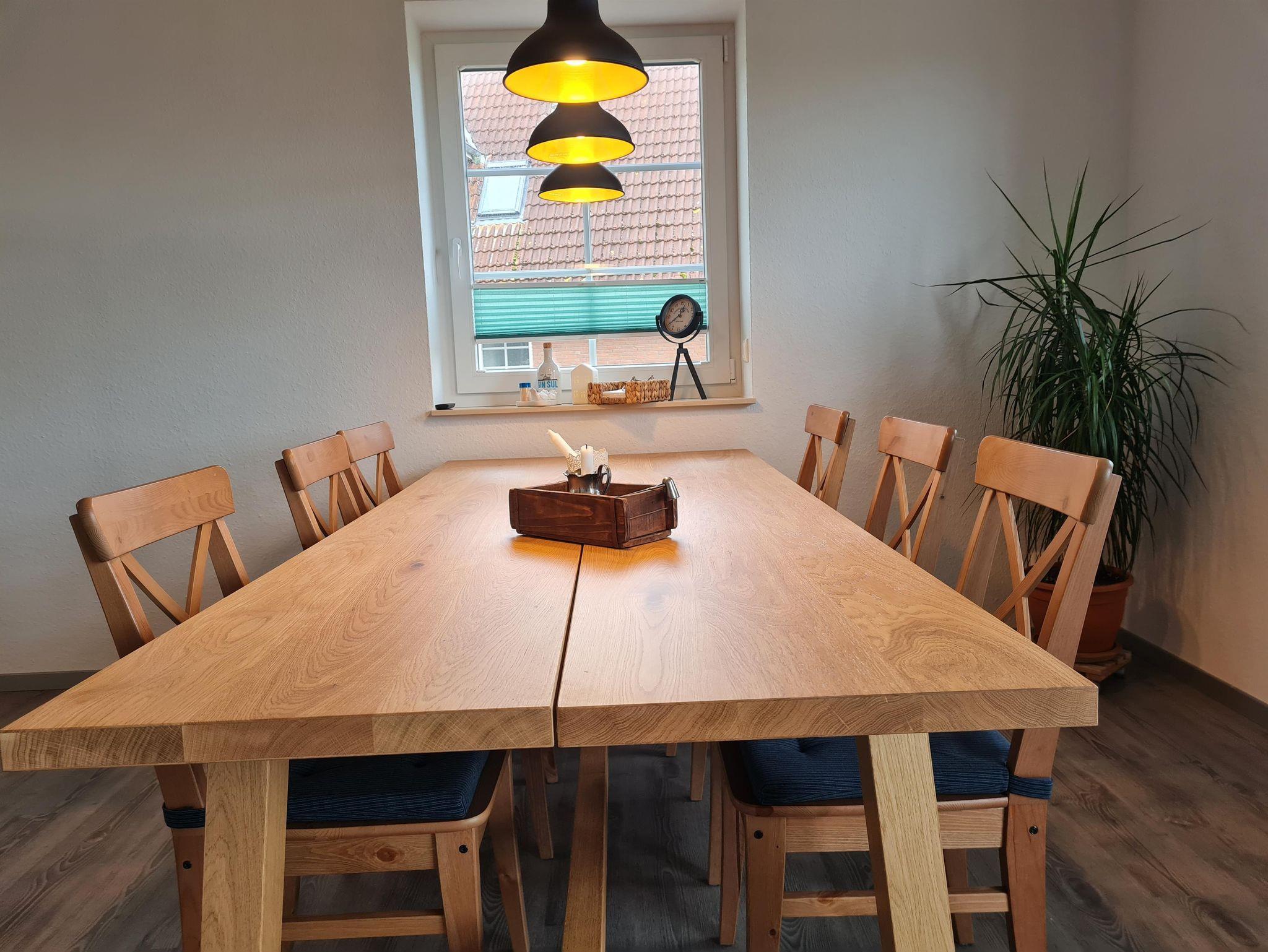 Am Esstisch finden sechs Personen bequem Platz. Kinderstühle stellen wir Ihnen auf Wunsch bereit.