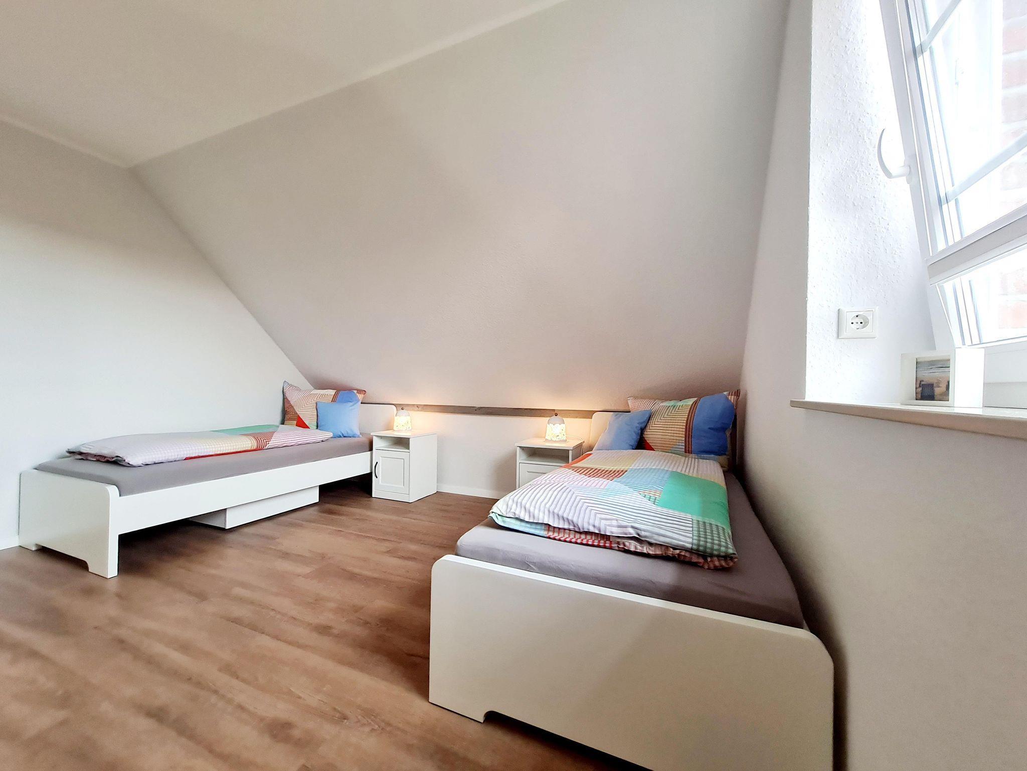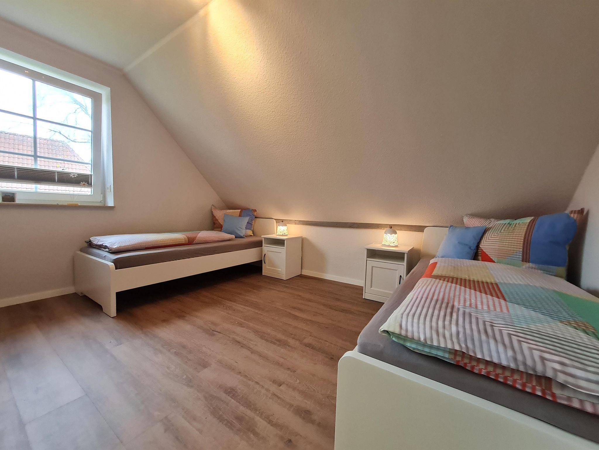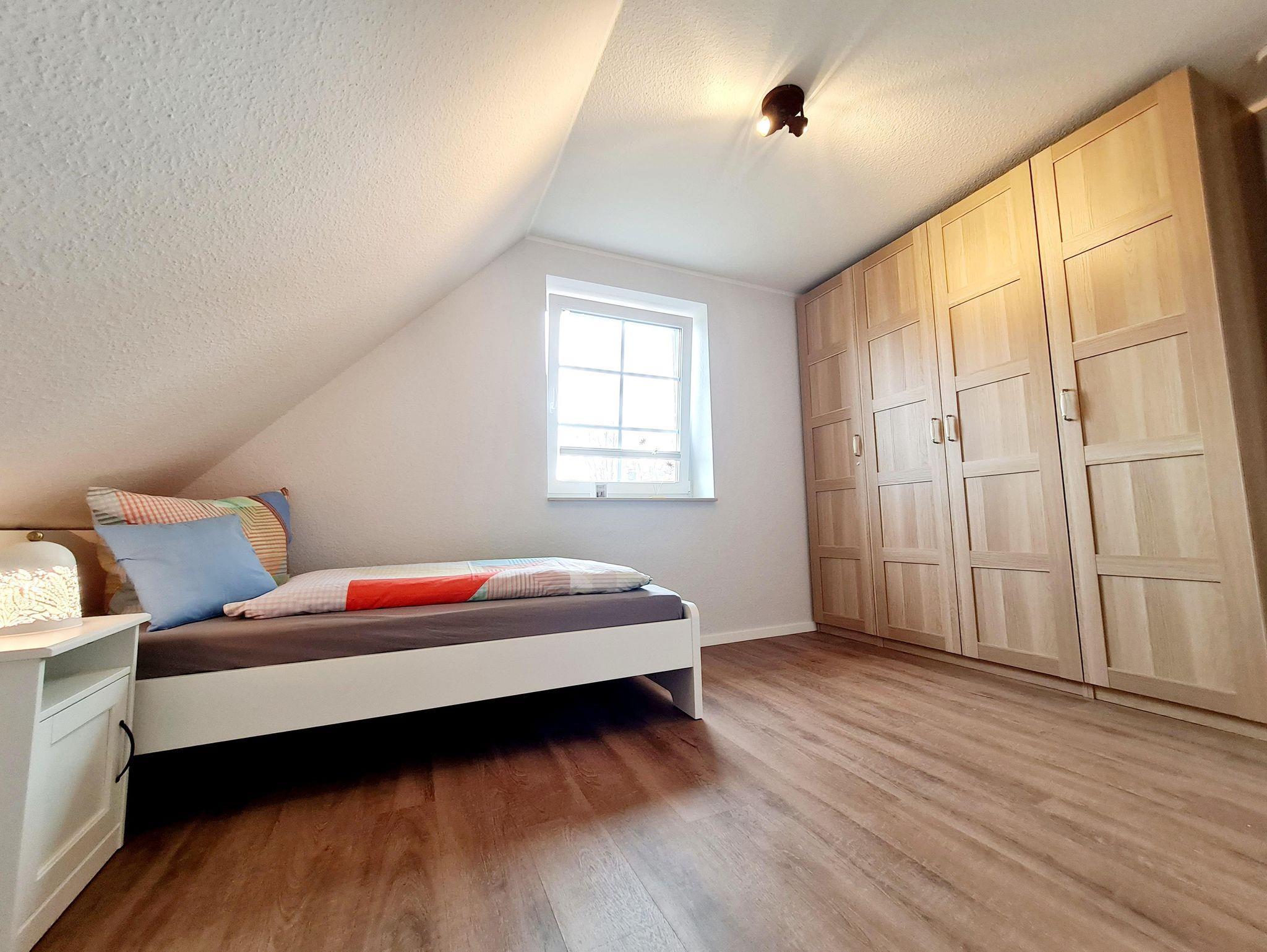 Über eine schöne Buchentreppe gelangen Sie in das Obergeschoss mit seinen drei Schlafräumen (zwei mit je zwei Einzelbetten, die zusammengestellt werden können und eines mit einem Doppelbett), die mit Nachttischen und großen Schränken ausgestattet sind.